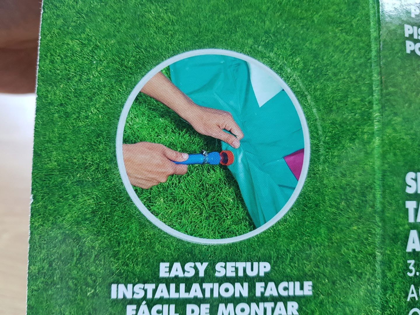 가까이 가서 설명을 보니 수도꼭지 호스를 패드에 연결하면 스프링쿨러식으로 물줄기가 나오고 패드 위쪽으로 물이 고여 그 위에서 물놀이를 할 수 있는 기구이다.