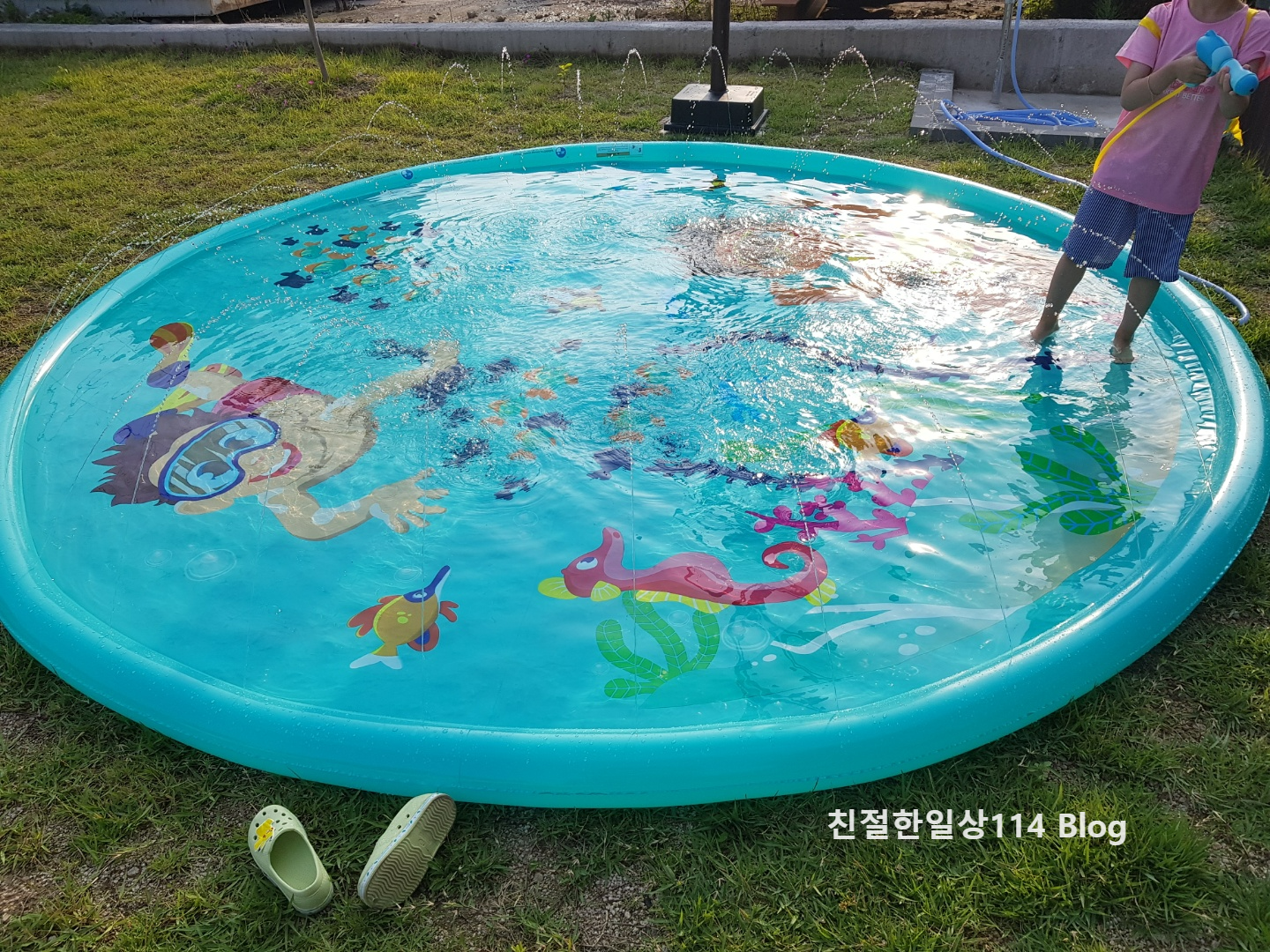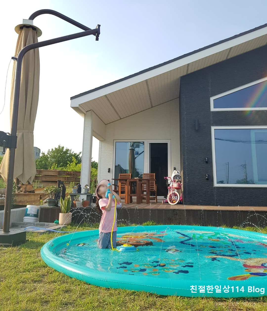 물놀이 패드로 물놀이를 한 첫날 2시간이 훌쩍 지나갈 정도로 재밌게 놀았다. 그리고 약속이 없는 주말마다 펼쳐서 아주 잘 사용하고 있다.