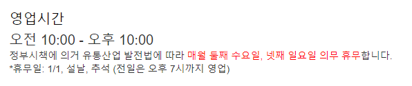 - 명절 휴무일: 1월 1일, 설날 당일, 추석 당일 (전일은 오후 7시 까지 영업)