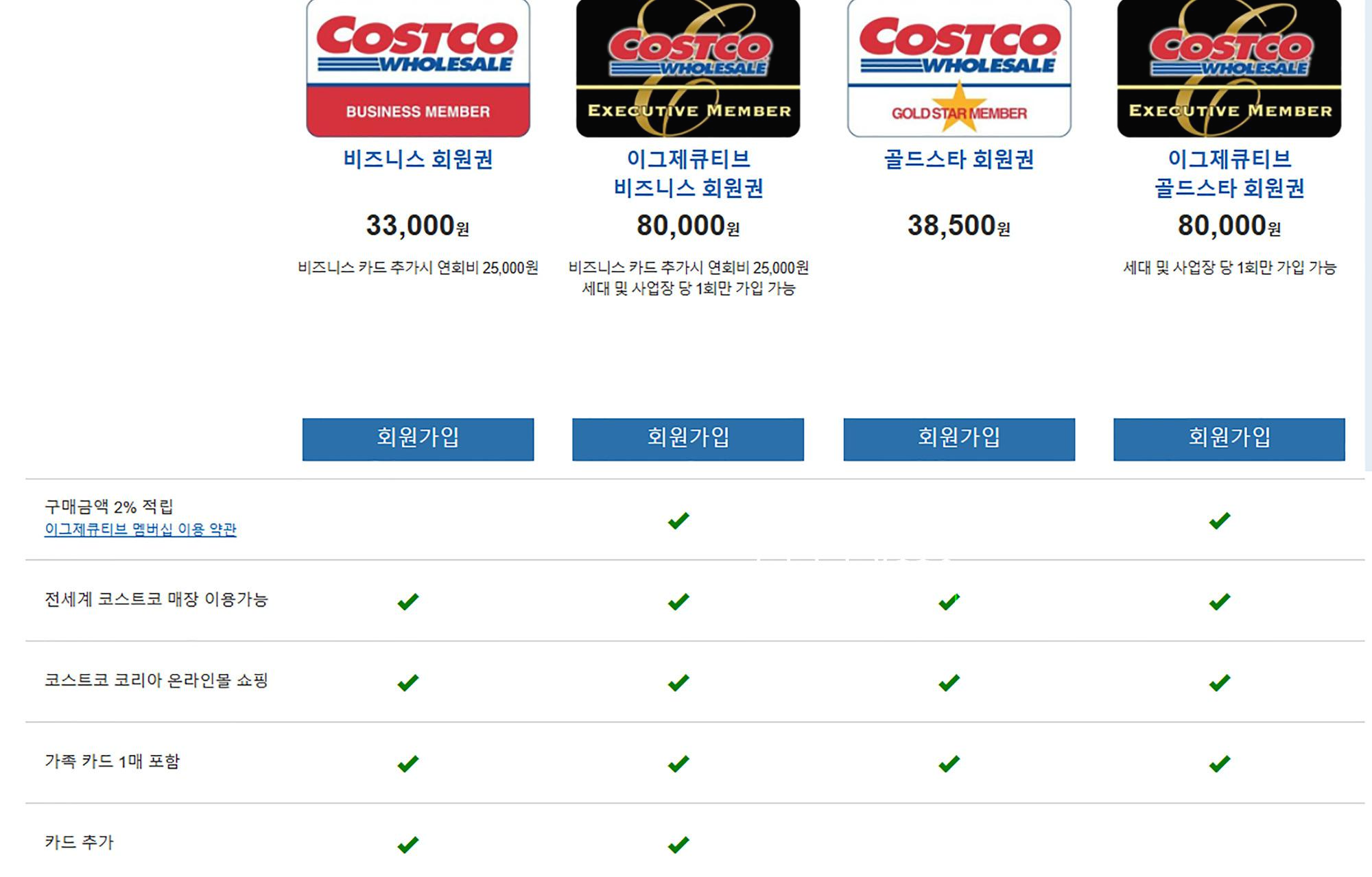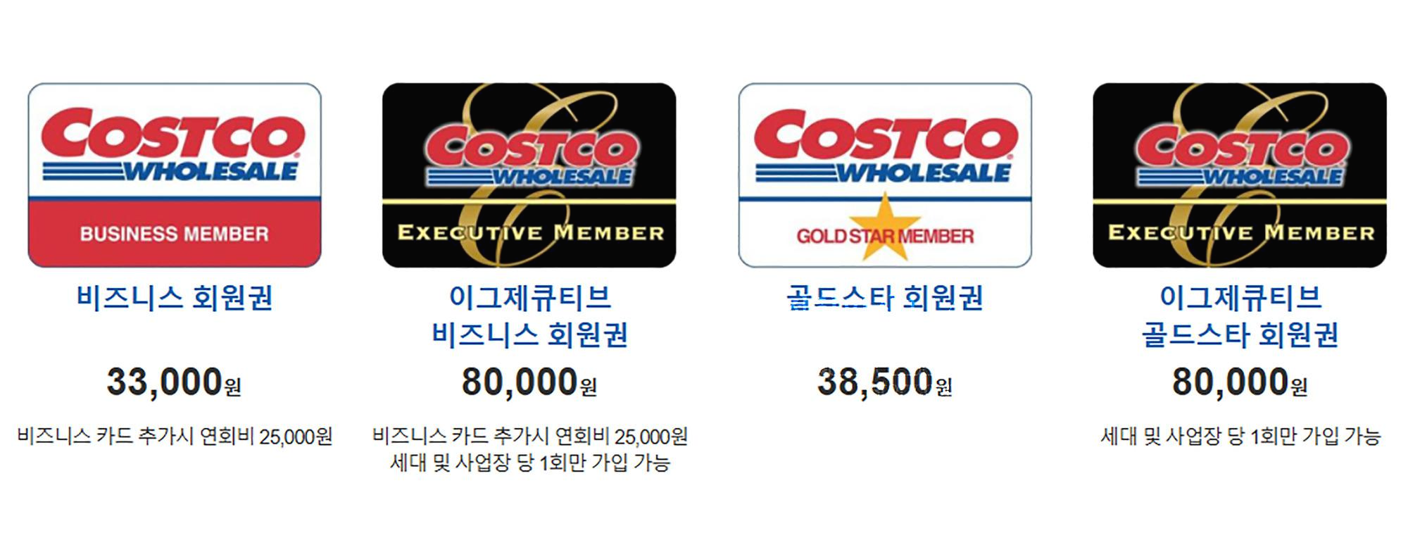 코스트코 회원권은 4종류이다. 가게나 매장등 사업자로등록된 업체서 가입할 수 있는 비지니스 회원권과 그외 일반 회원권인 골드스타가 있다. 여기에 2% 리워드 혜택이 주어지는 업그레이드 카드격인 이그제큐티브 회원권이 있다.