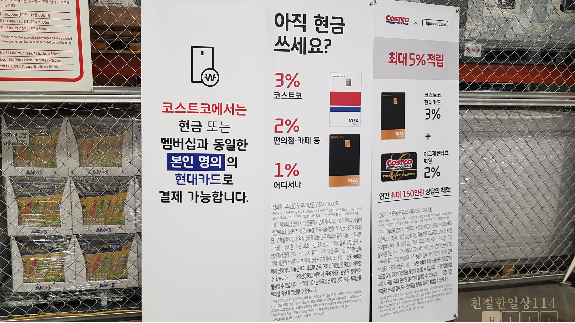 코스트코는 현금과 제휴카드사 1곳, 현대카드로만 결제가 가능하다. 작년까진 현금과 삼성카드만 됐었는데 삼성과 결별하고 현대와 손을 맞잡았다.