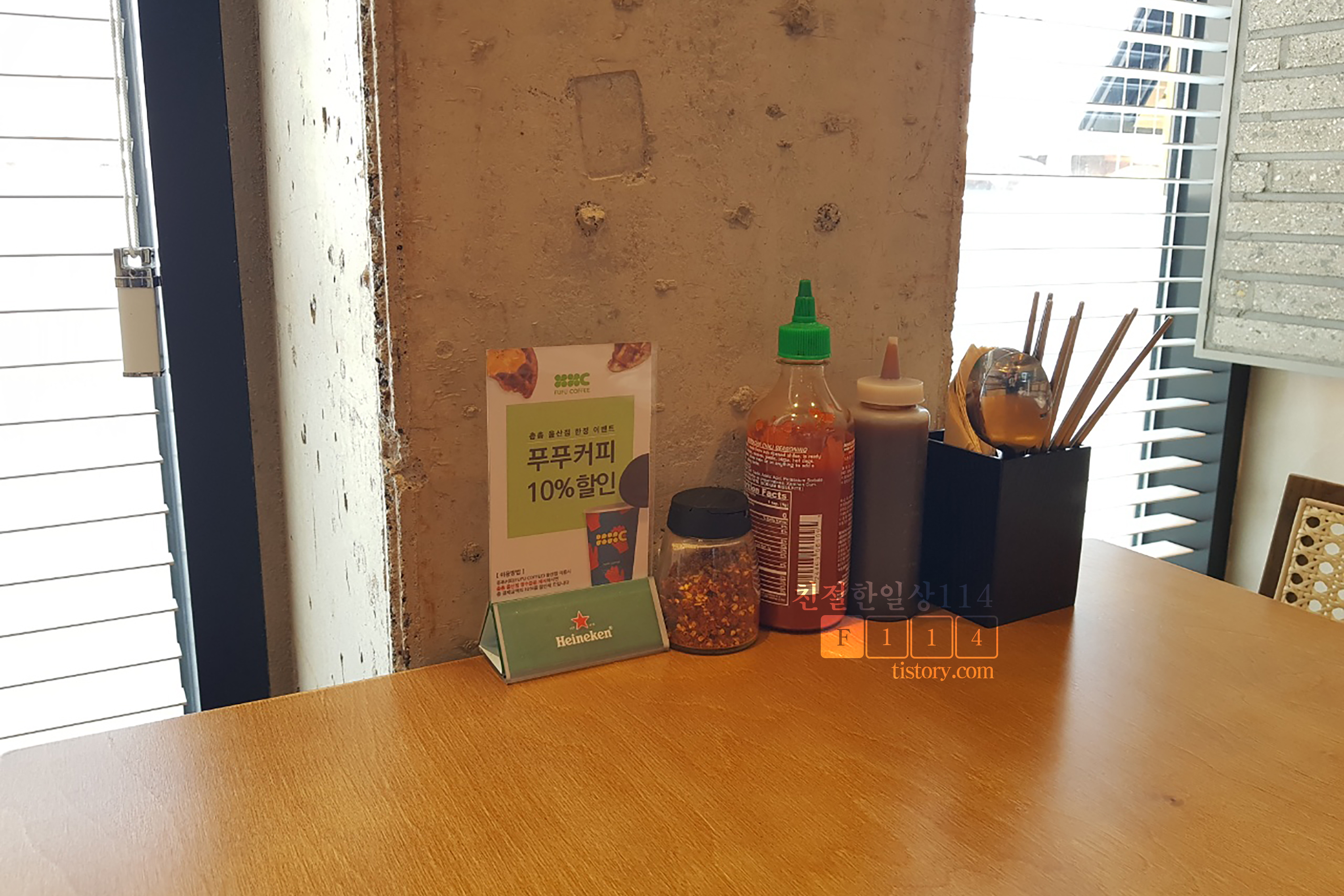 테이블에는 수저통과 소스통이 준비되어있다. 필자가 좋아하는 닭소스(매운소스)이다.