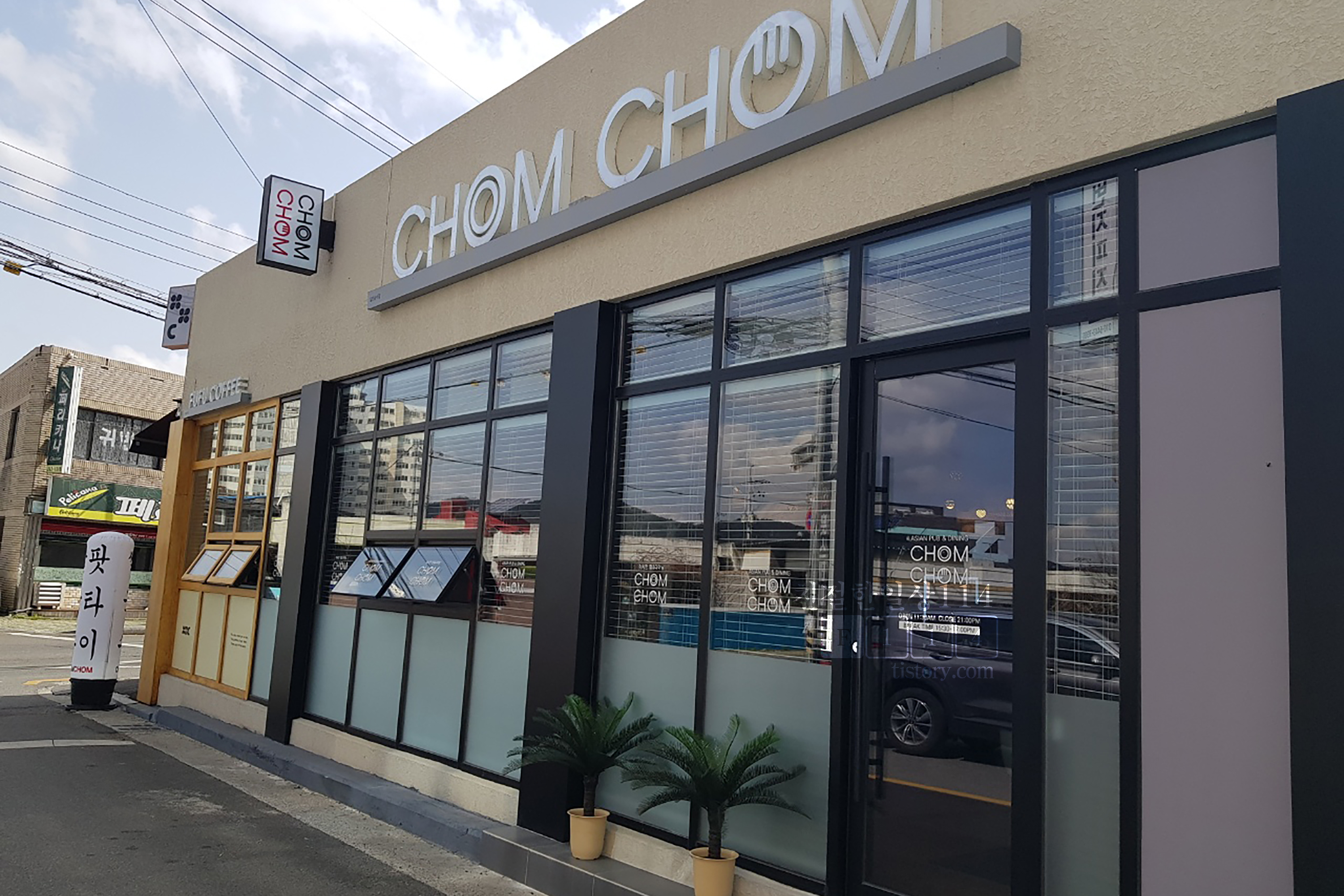 단층건물이며 네모반듯 깔끔하고 모던한 디자인이다. 세련된 아시안 식당의 느낌이 든다. 식당 옆으로 푸푸커피숍이 보이고 커피숍 앞에 촘촘에서 내 놓은 홍보물이 도로가에 서 있다.