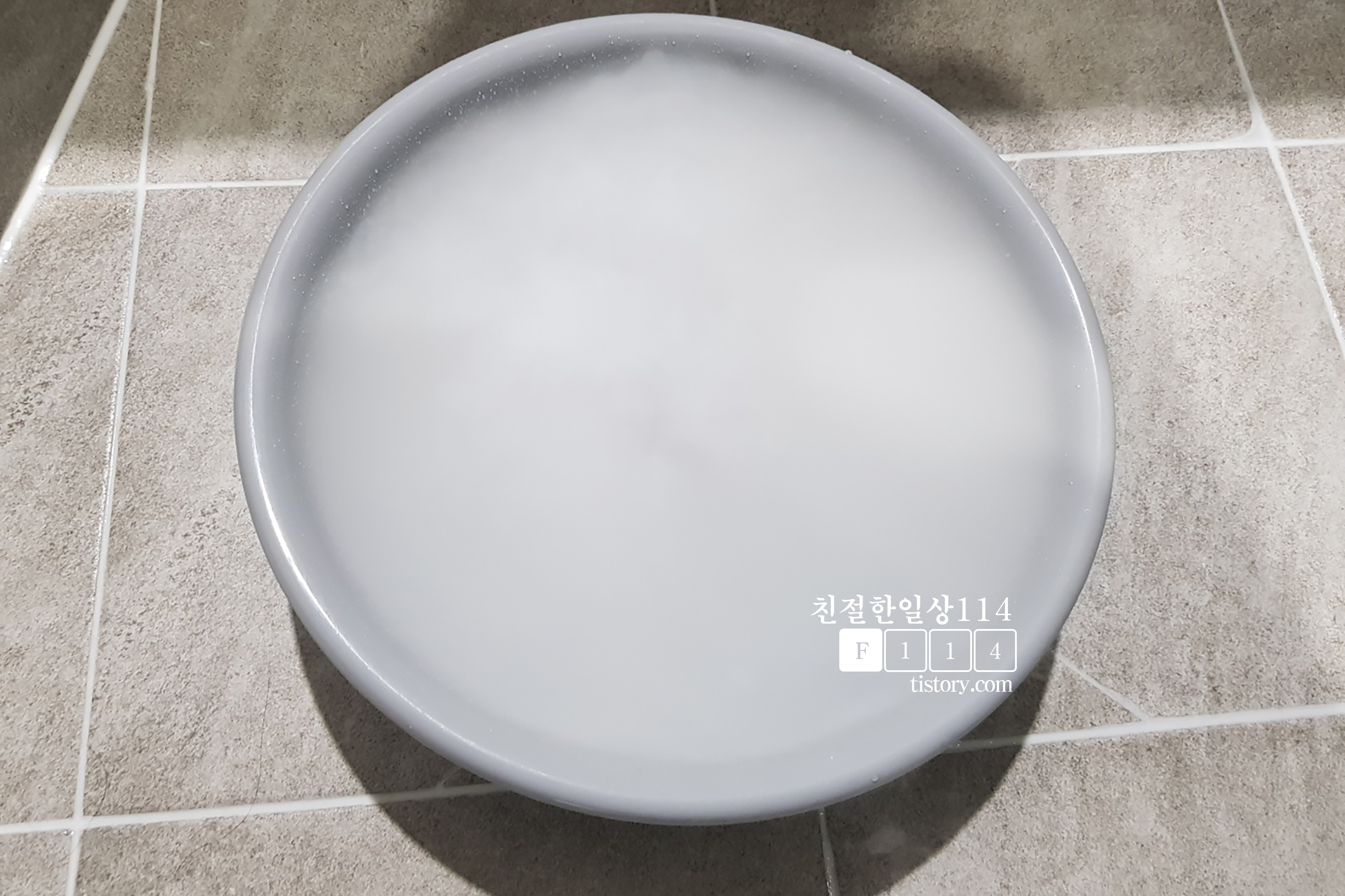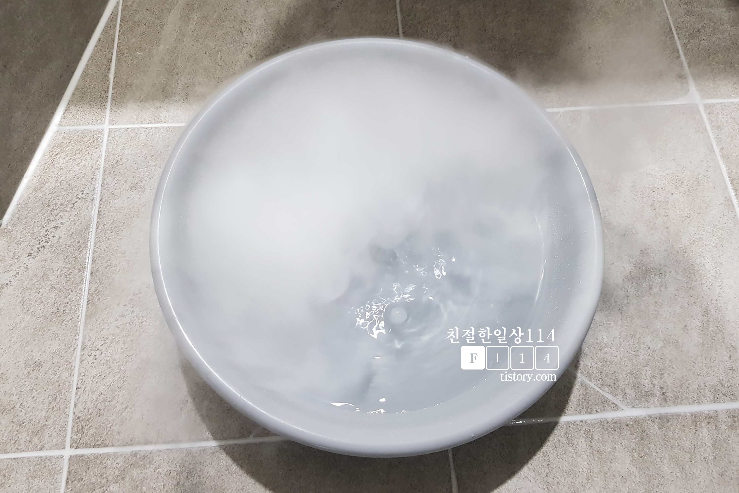 물을 받아둔 대야에 드라이아이스를 넣어보았다. 그러자 바로 뽀그르르 귀여운 소리를 내며 물안개를 만들어 낸다. 뽀얀 물안개로 금방 덮여서 잘 안보일 수 있는데 가만히 들여다보면 하얀 구슬같은 방울들이 수면위로 올라오는게 보인다.