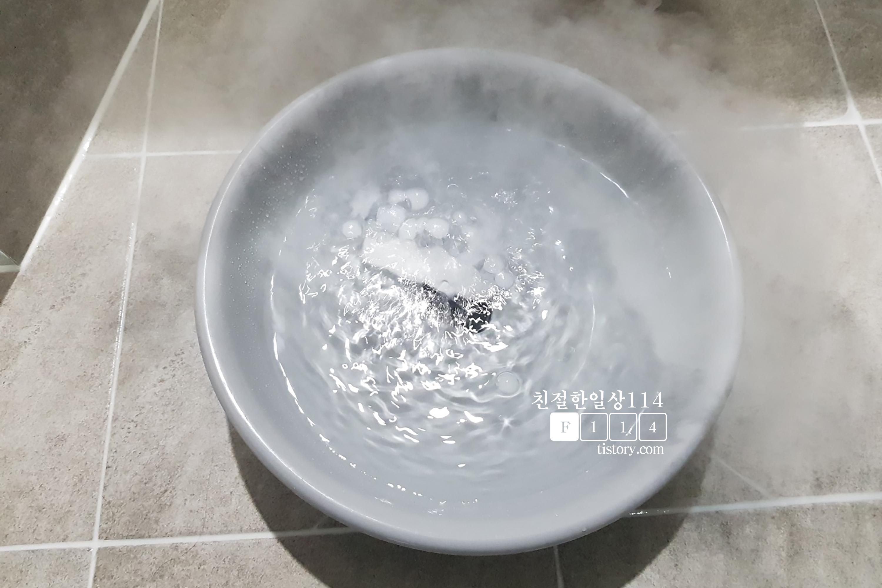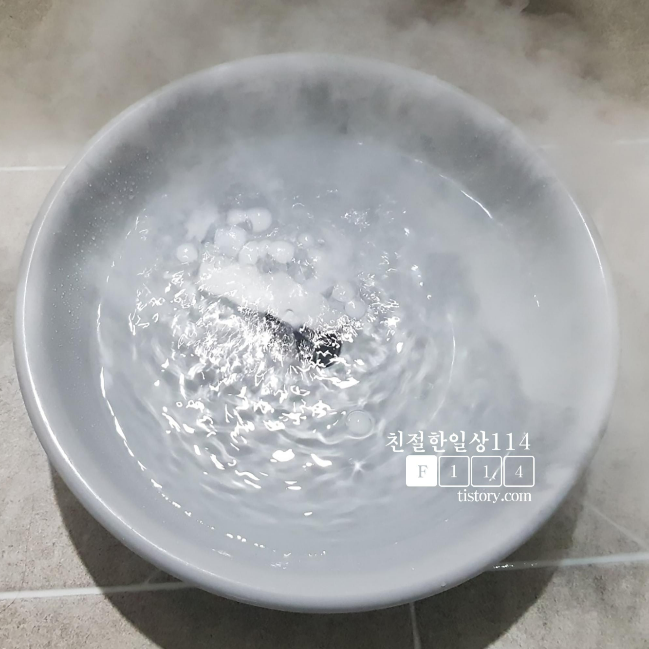 소리도 시원하고 재밌고, 순식간에 소복히 쌓이는 물안개가 재밌어서 계속 보게 된다. 물안개가 대야 가득 모이면 입으로 바람을 불어서 날려버리고 모이면 또 입바람을 불고 반복해서 논다. 아래에 드라이아이스를 물에 넣었을때 나는 물방울 소리와 안개가 만들어지는 동영상을 올려본다.