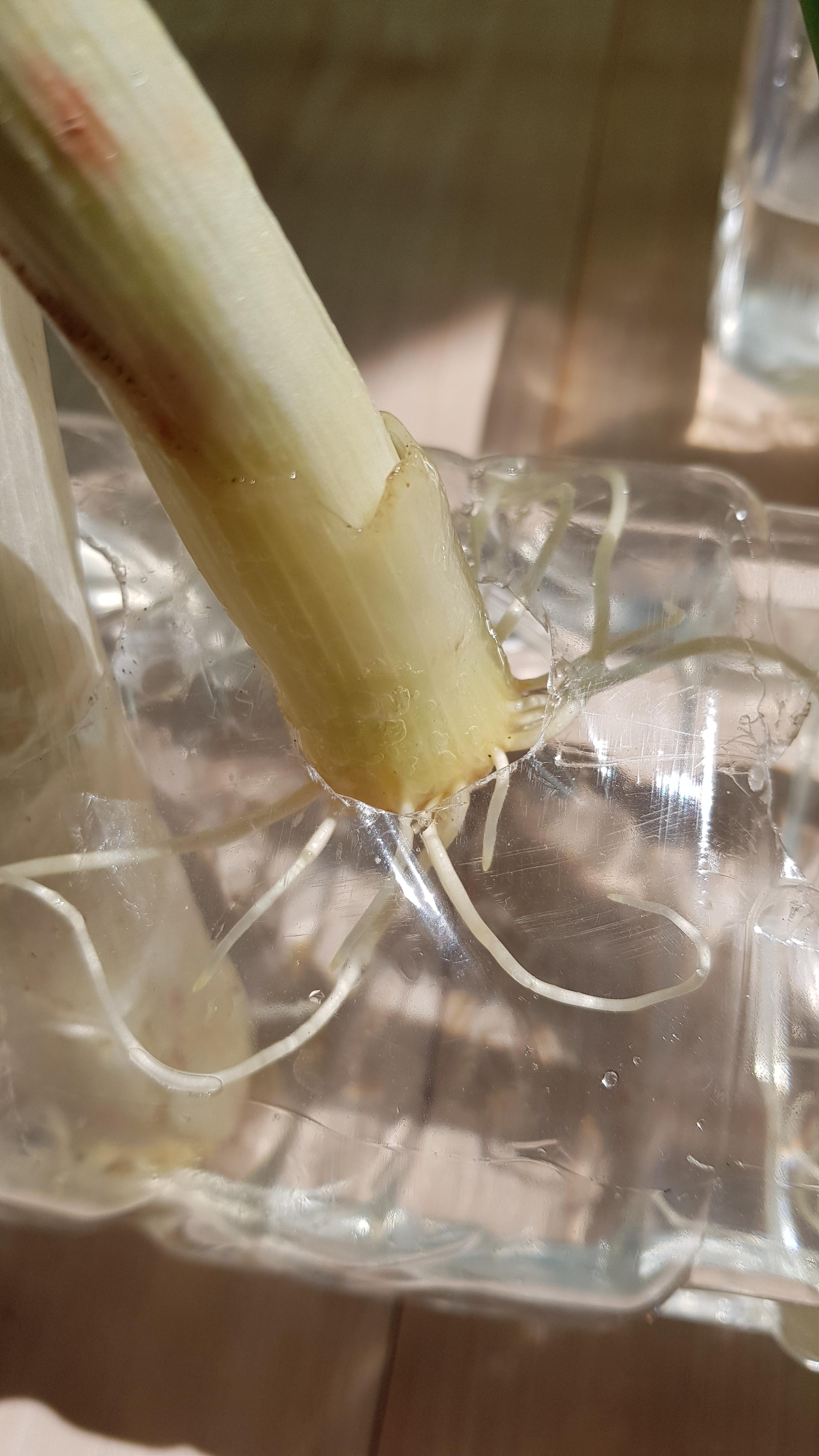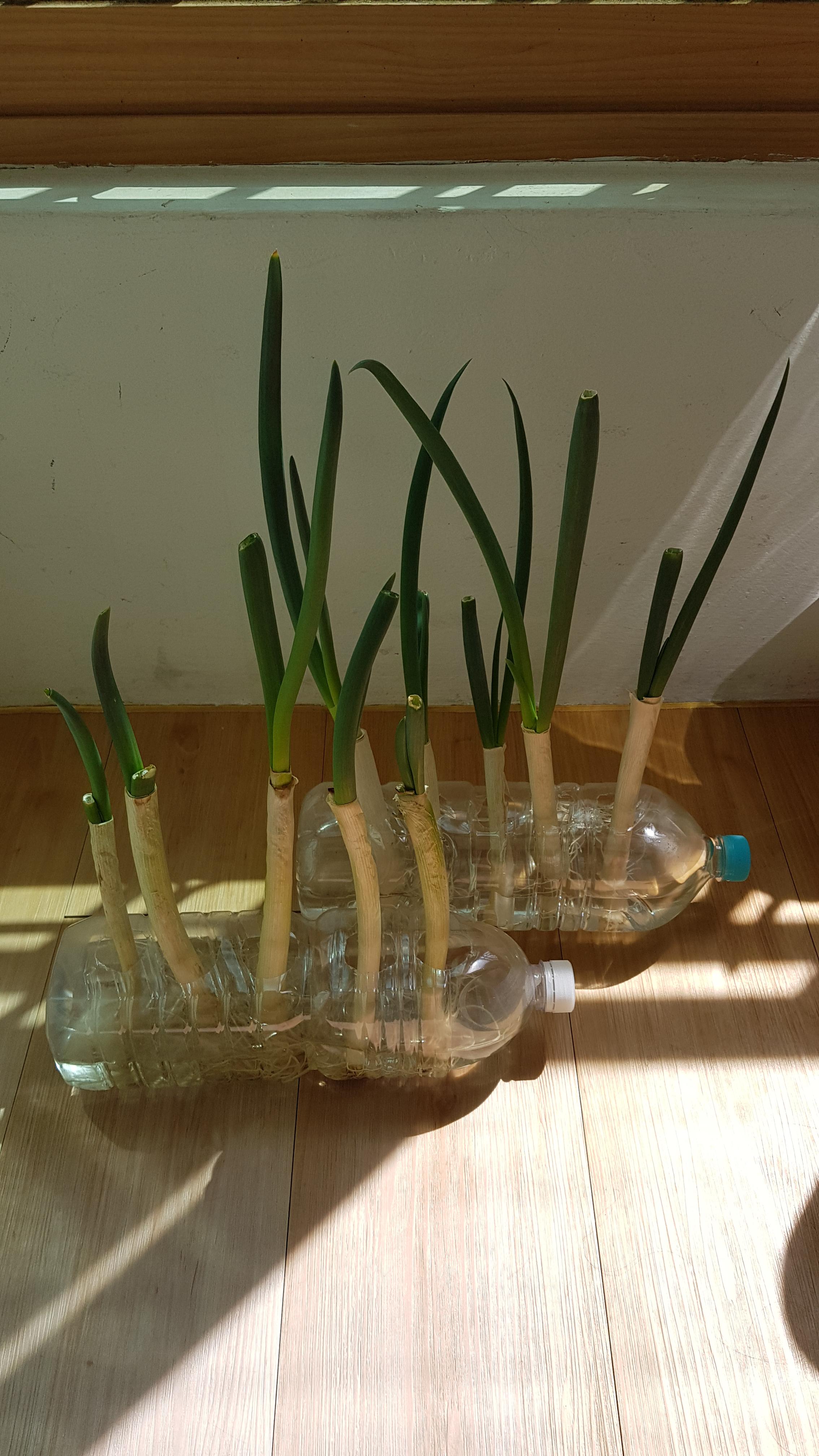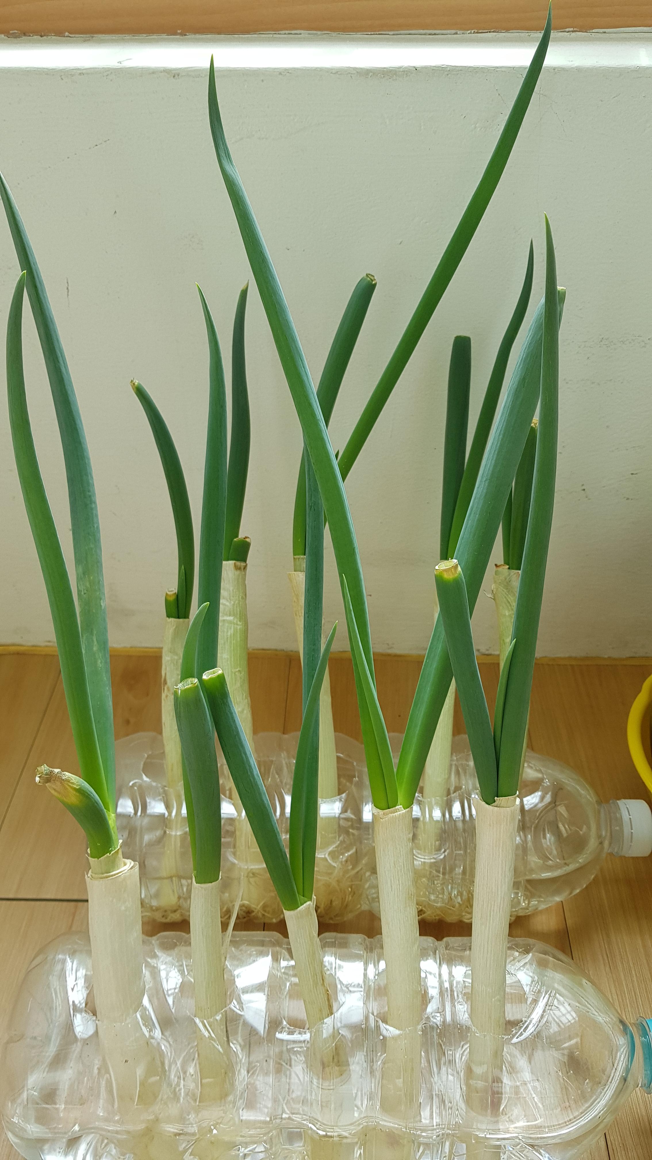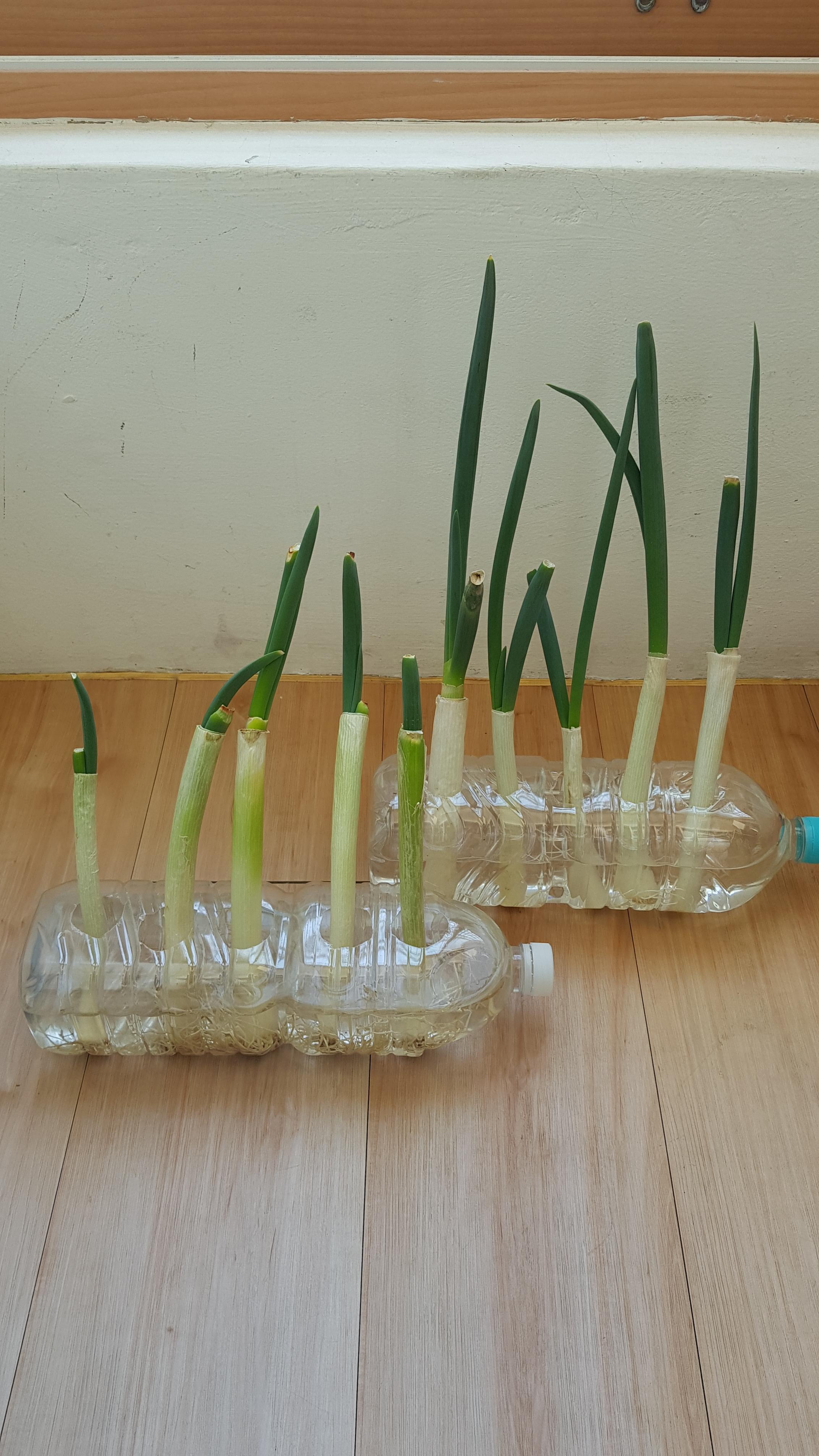 앞쪽에 페트병에 있는 대파가 나중에 심은 파로 2일차에 접어들었고 뒤쪽 페트병에 있는 대파는 먼저 심은 파로 10일차에 접어들었다.