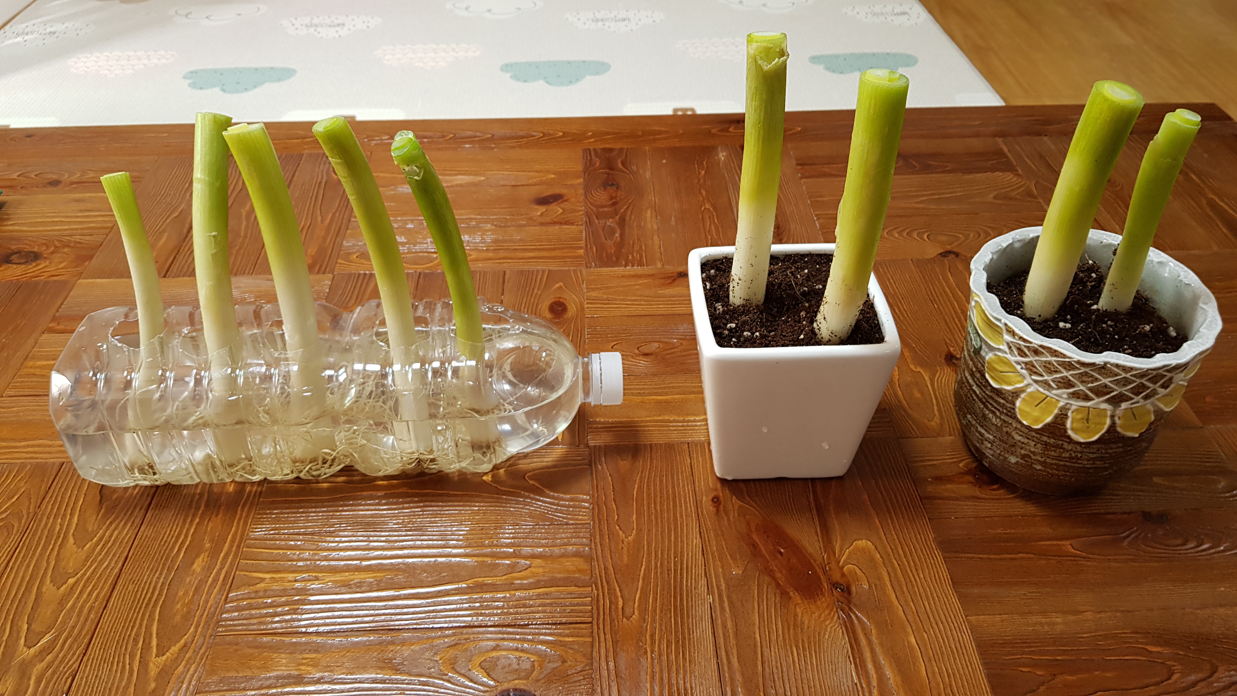8일전 마트에 장을 보러 갔다가 파를 사와 집에서 키운지 8일이 지났다. 일주일이면 심은 대파를 잘라서 먹을 수 있을줄 알았는데 그정도까지 자라지는 않는다. 심을 당시 편하게 수경재배로 키울생각에 페트병에 구멍을 뚫어서 심고, 심고도 파뿌리가 남아 집에 있는 화분으로 나머지를 심었다. 뿌리가 길지 않은 파라서 잘 자랄까 의심스러웠지만 그래도 하루하루 눈에 띄게 올라오는 대파를 보면 재밌고 신기하기도 하다. 지금부터 대파를 처음 심었을때부터 8일차까지 성장과정을 사진으로 살펴보려고한다. 흙에 심은 파와 물에 심은 파중에 누가누가 더 잘 자라는지 예상하고 보면 더 재밌을듯 하다.