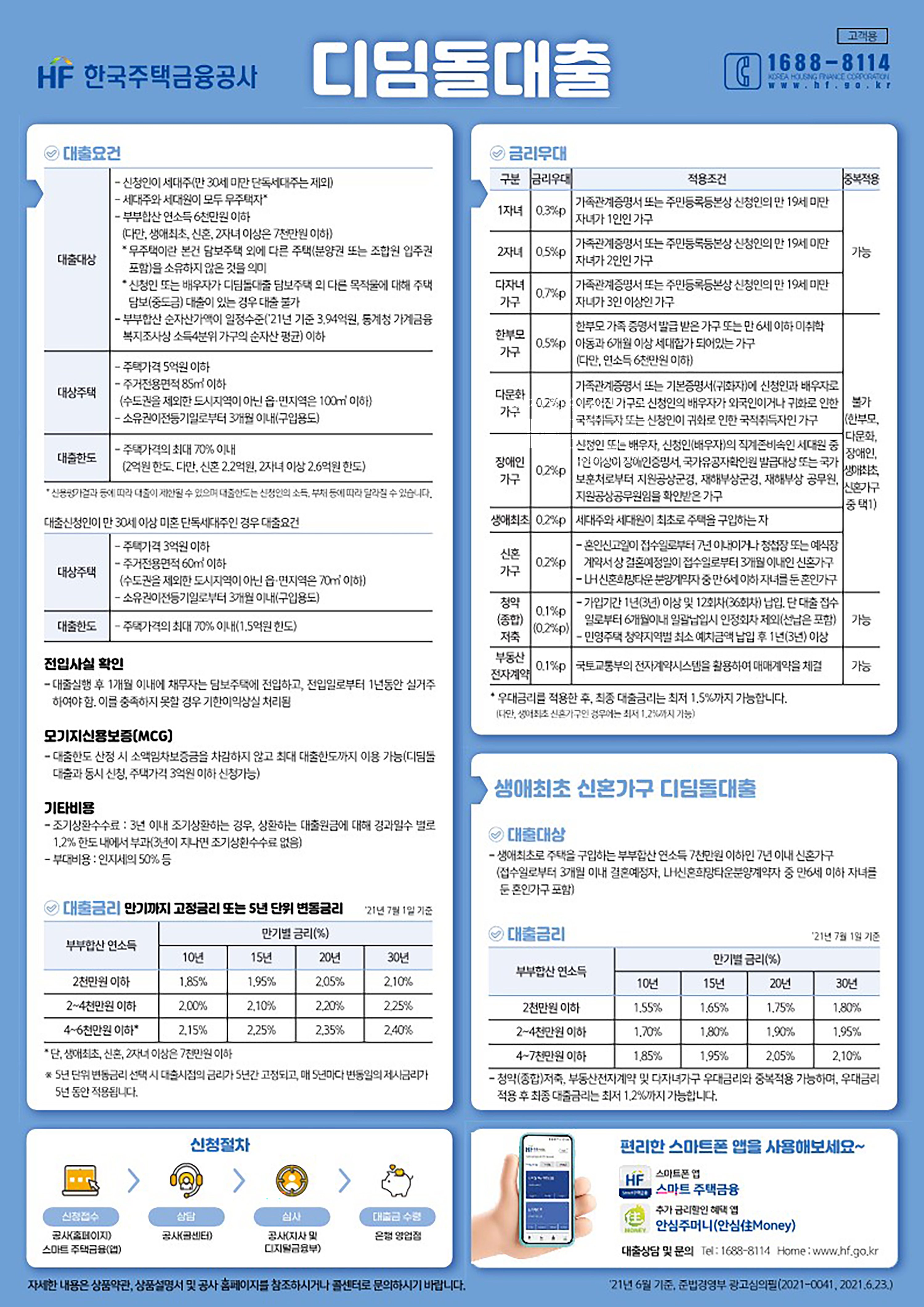| 주택도시기금 주택담보대출 - 내집마련디딤돌대출 (정부지원 3대 서민 구입자금 통합 저금리 대출 / 대출금리 연 2% ~ 연 2.75%) (0) | 2022.01.11 |