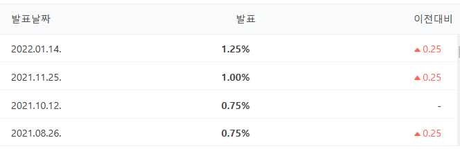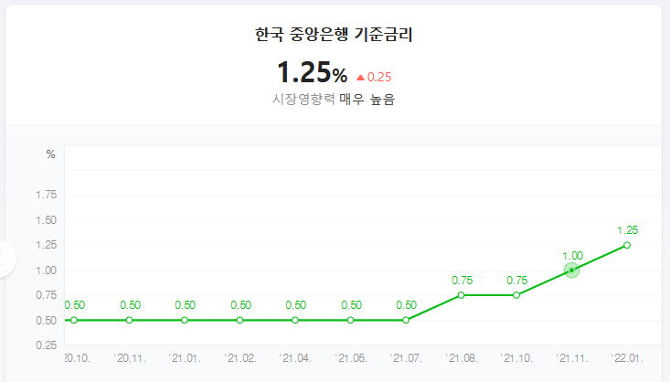 작년 7월 한차례 인상되었던 기준금리가 8월, 그리고 11월, 22년 1월 이렇게 연이어 올랐다. 그리고 한국은행에서는 '기준금리 여전히 완화적' 이라는 입장으로 앞으로도 금리를 추가인상할 수 있음을 시사했다.