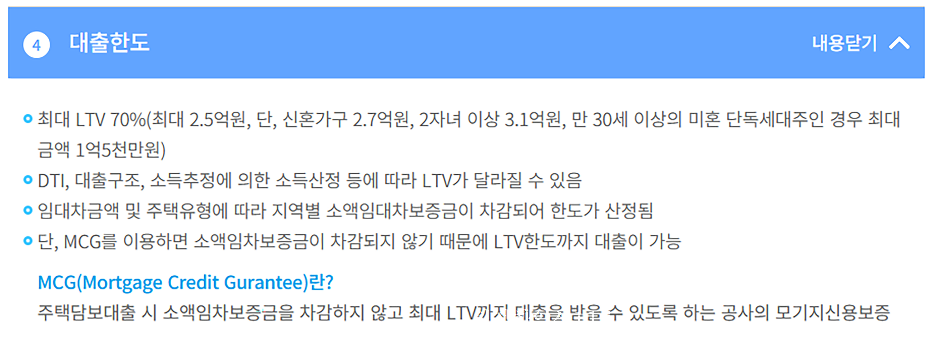 - 단 MCG를 이용하면 소액임자보증금이 차감되지 않기 때문에 LTV한도까지 대출 가능