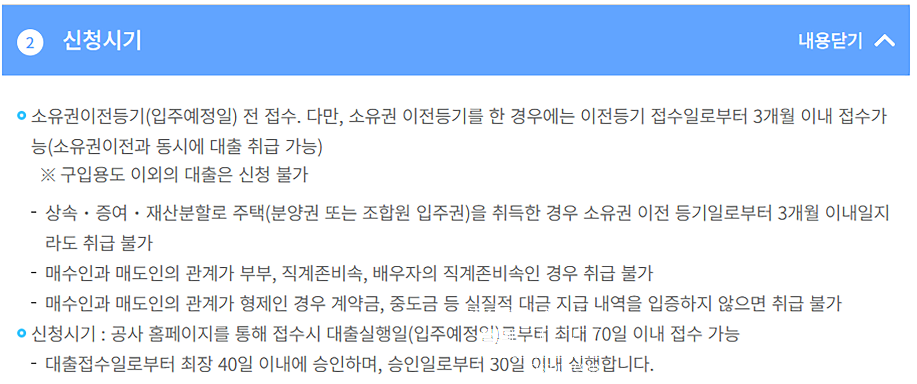 - 신청시기: 공사 홈페이지를 통해 접수시 대출실행일(입주예정일)로 부터 최대 70일 이내 접수 가능
