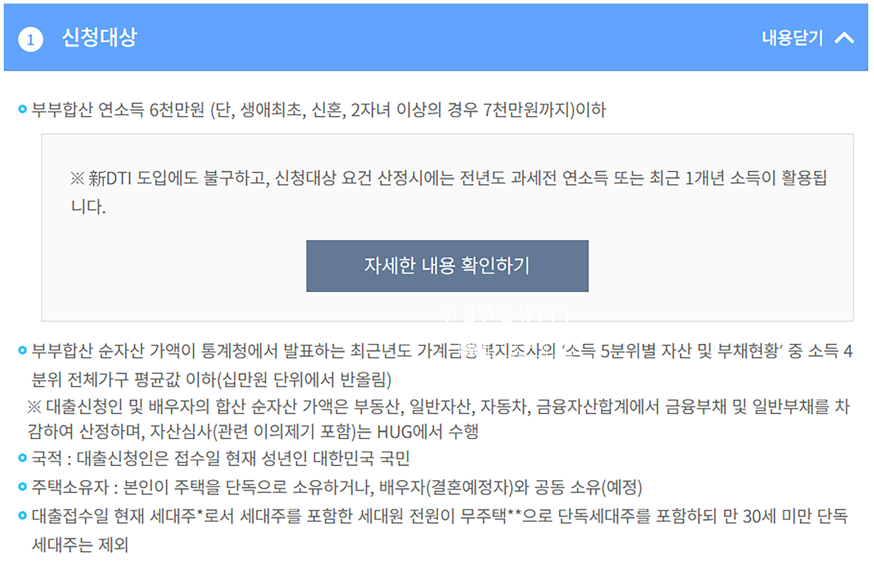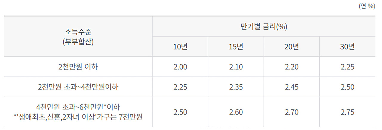 - 부부합산 연소득 6천만원 이하(생애최초, 신혼, 2자녀 이상의 경우 연소득 7천만원 이하)