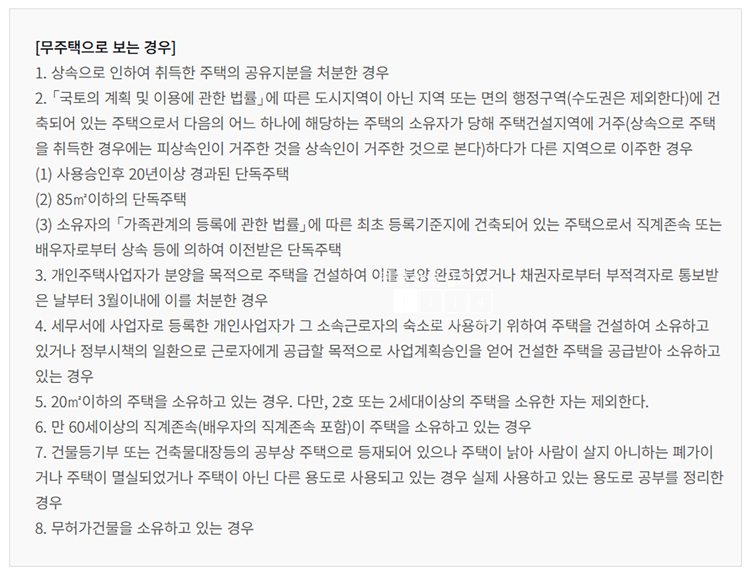 - 20m2 이하의 주택을 소유하고 있는 경우 (다만 2호 또는 2세대 이상의 주택을 소유한 자는 제외)