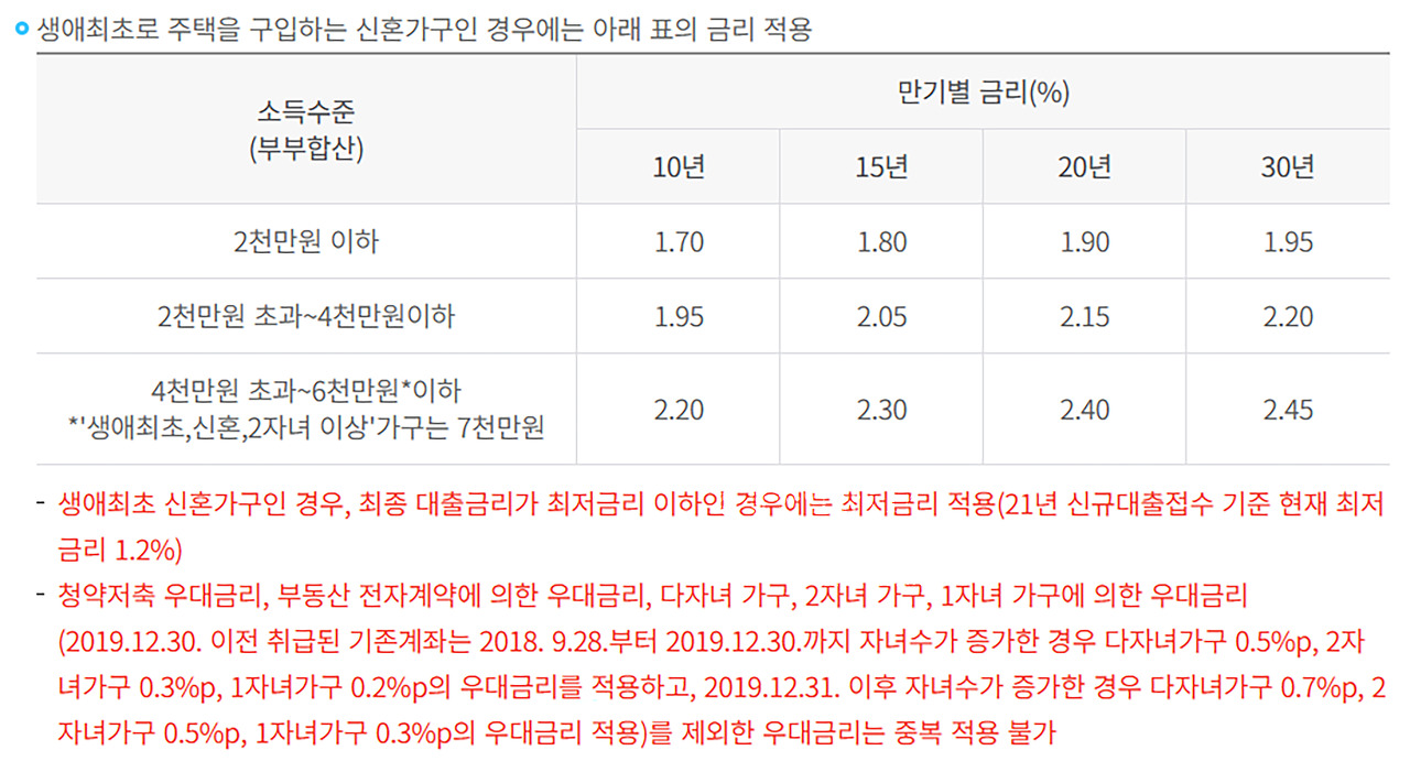생애최초로 주택을 구입하는 신혼가구인 경우에는 금리 1.7% ~ 2.45% 사이로 대출을 받을 수가 있다. 여기에 청약저축 우대금리, 전자계약 우대금리, 다자녀 가구, 2자녀, 1자녀 가구에 대한 우대금리를 추가로 금리를 인하 적용 받을 수가 있다.