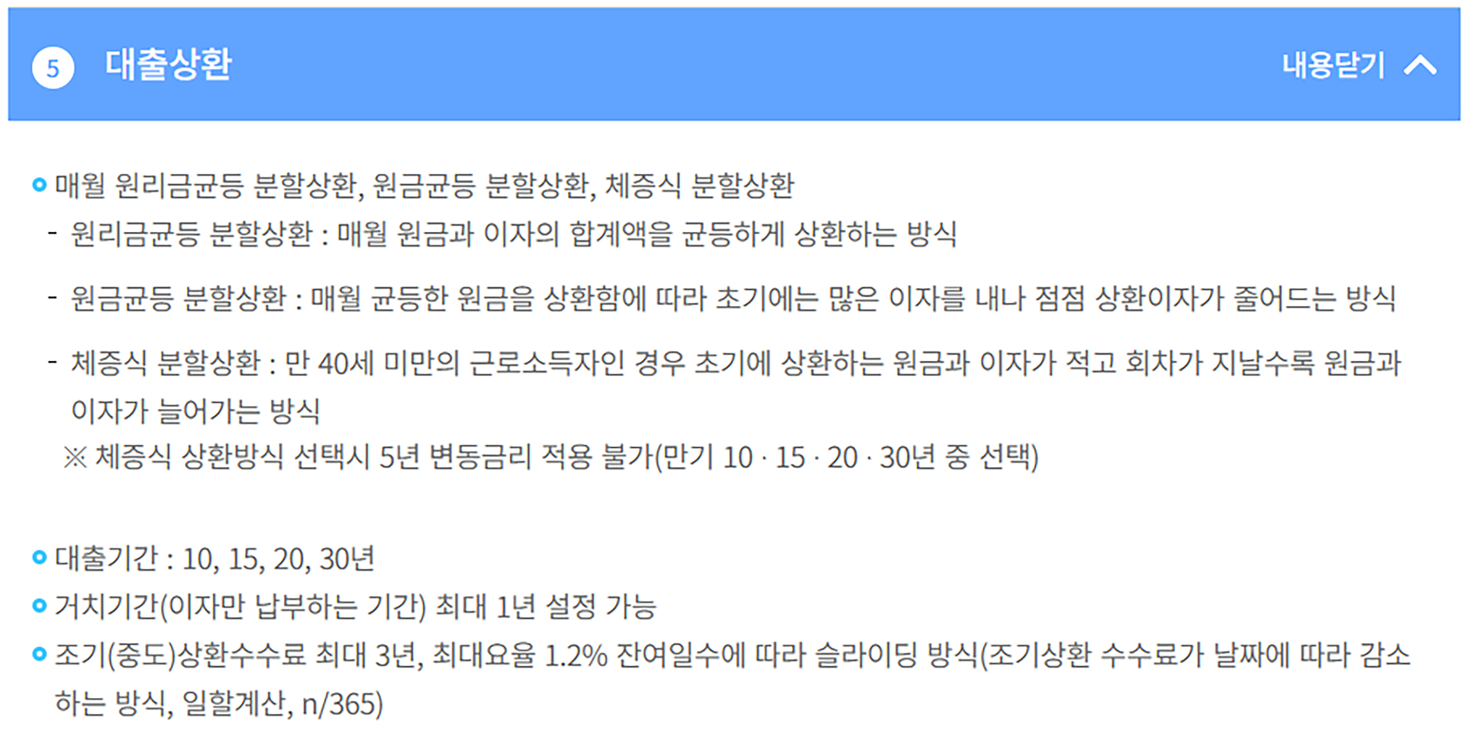- 조기(중도) 상환수수료 최대 3년, 최대요율 1.2% 잔여일수에 따라 슬라이딩 방식
