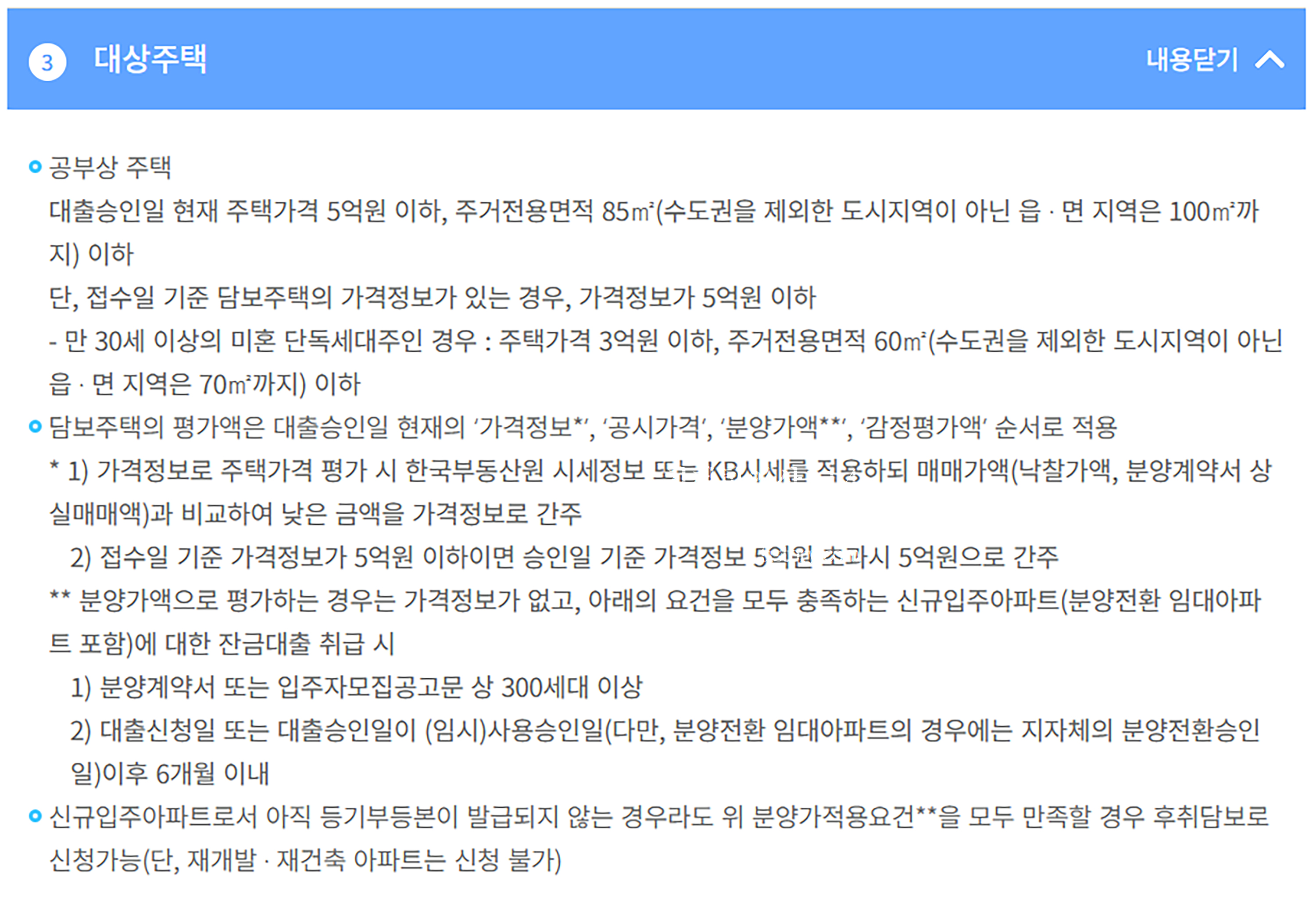 - 담보주택의 평가액은 대출승인일 현재의 '가격정보', '공시가격','분양가액','감정평가액' 순서로 적용