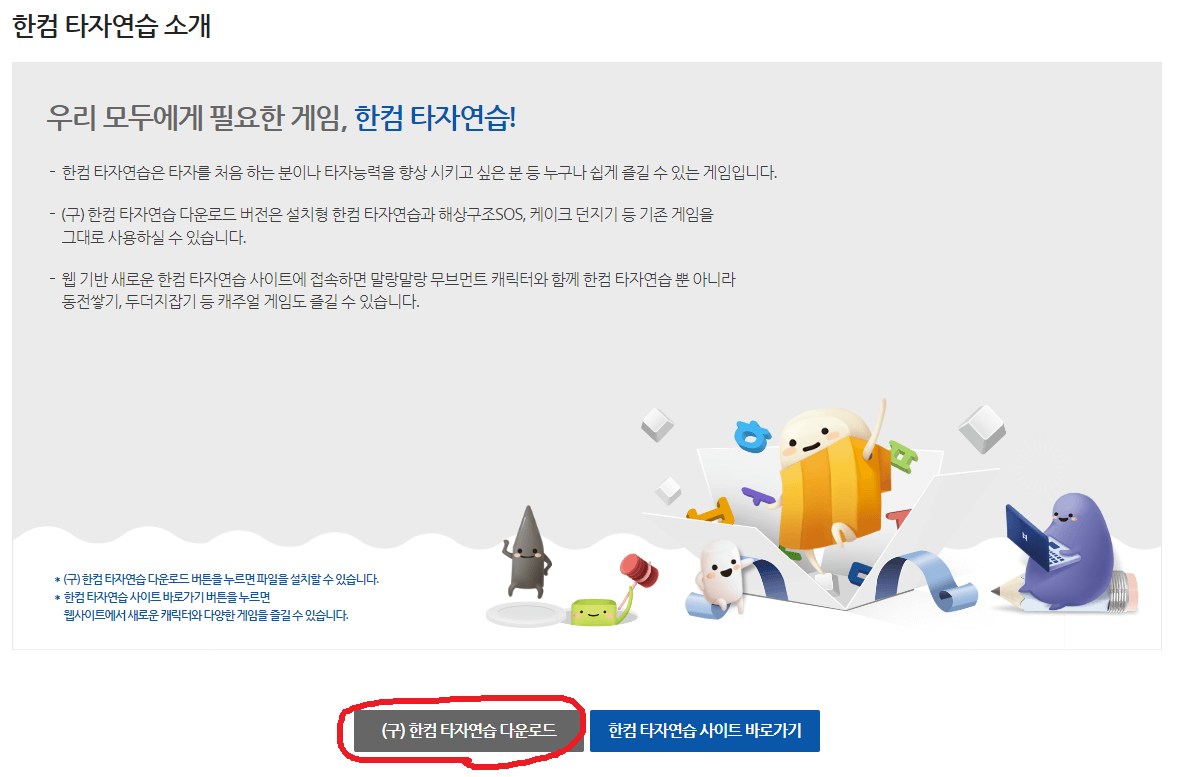 위 링크 클릭시 열리는 창에서 빨간색 동그라미로 표시해둔 한컴 타자연습 다운로드를 선택한다.