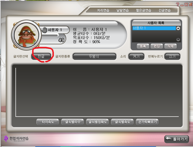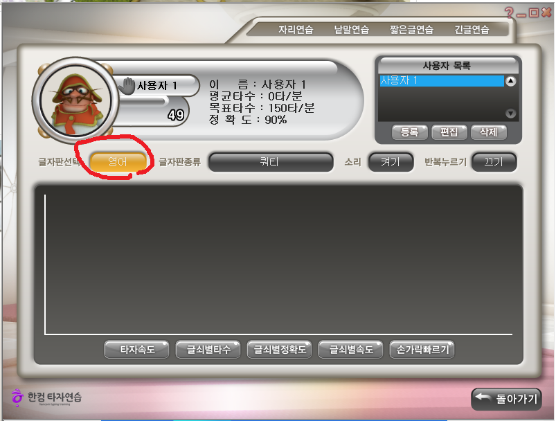 4번의 타자연습 종류 선택하기 화면에서 오른쪽 아래 설정/통계 버튼을 클릭해서 들어간다. 그러면 위 화면으로 전환되며 여기서 '글자판선택' 을 클릭하면 영어 or 한글로 바꿀 수 있다.