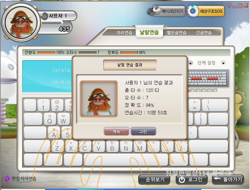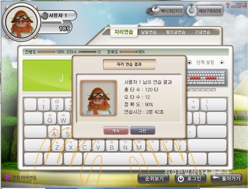 연습을 하면 결과를 보여주는 화면이 팝업으로 뜬다. 연습을 계속 또는 그만을 선택할 수 있다.