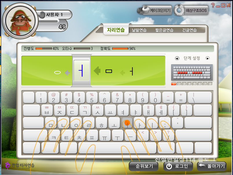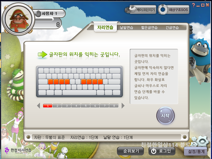 필자가 원했던 타자 연습프로그램은 어느 손가락으로 타이핑을 해야하는지 직관적으로 알기 쉽게 되어있는 프로그램이었다. 가장 기초인 자리연습부터 시작하는 참이라 컴퓨터를 이제 막 배우는 초보나 어린이들 수준의 프로그램을 찾았었는데 한컴 타자연습이 잘 맞았다