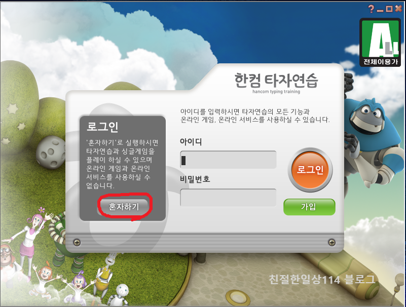 2. 혼자하기: 회원가입 필요없이 타자연습과 싱글게임을 할 수 있다. 온라인 게임과 온라인 서비스를 이용할 수 없다.