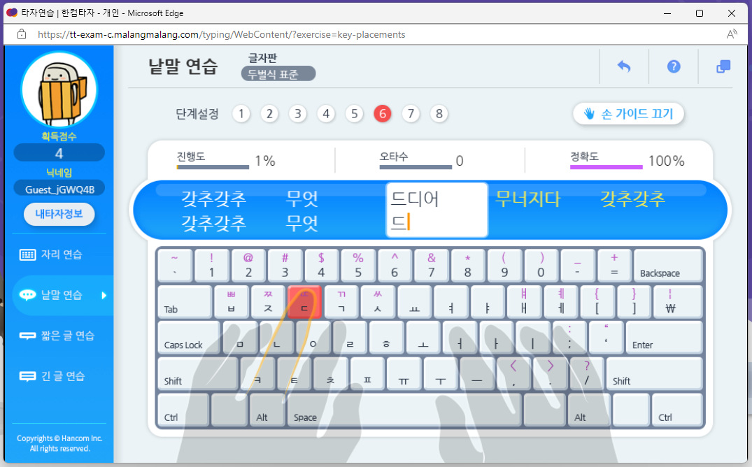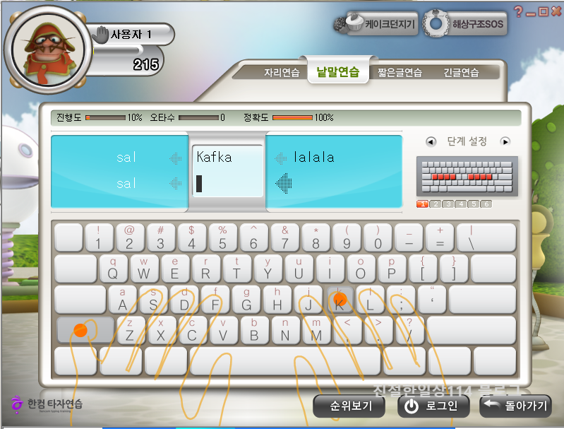 영어타자도 기본 자리연습부터 시작해 본다. 한글과 동일한 화면구성으로 손가락 자리 연습을 쉽게 할 수 있다.