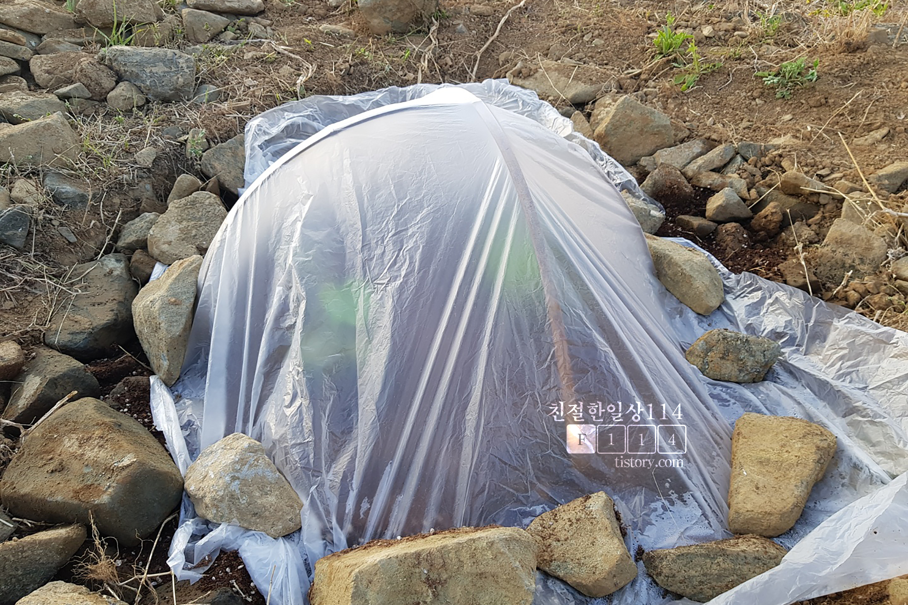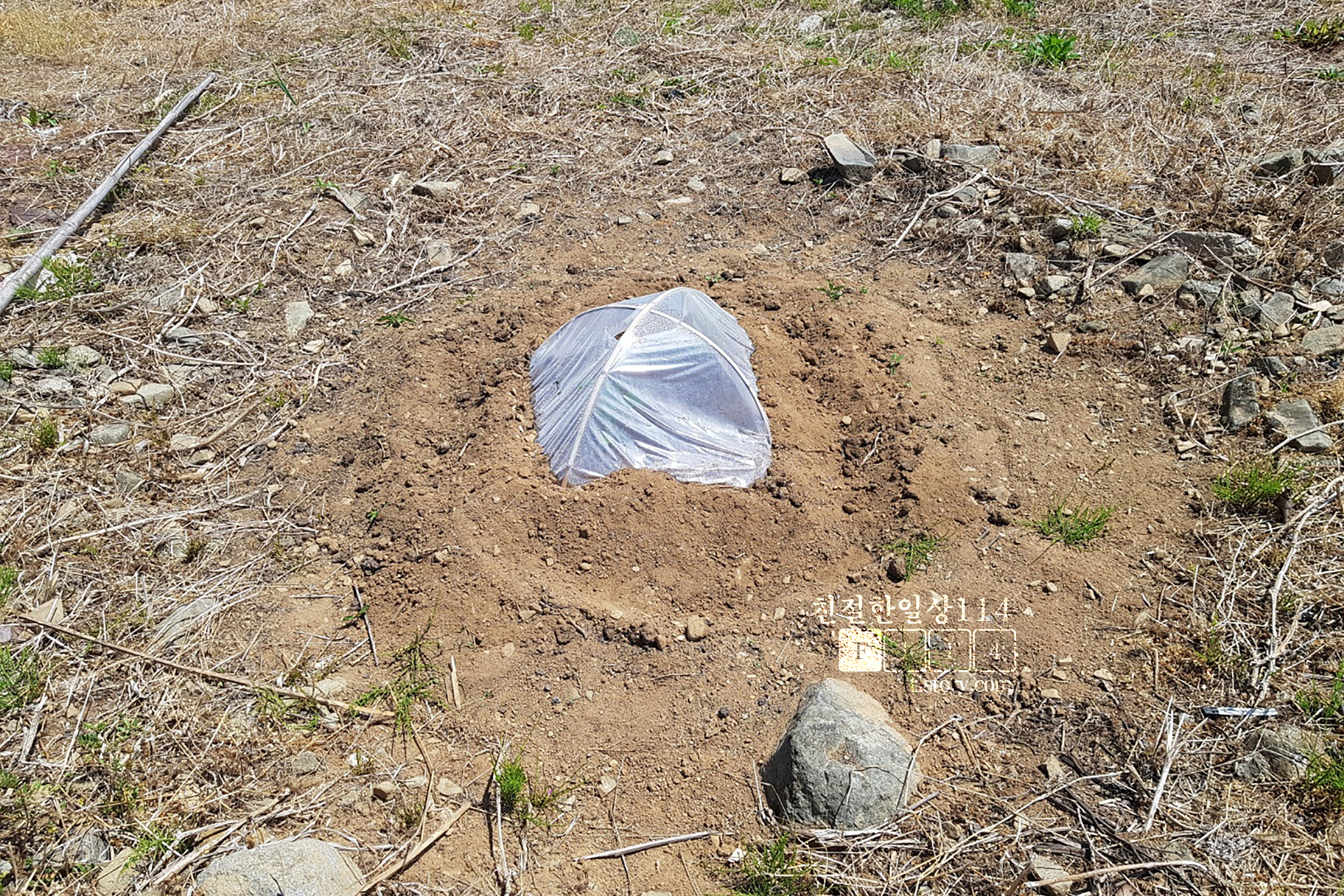 이웃집 할아버지께서 키워둔 모종이 있으니 가져다 심으라고 한다. 그래서 모종을 심기 하루 전 호박 심을 곳에 물을 흠뻑 뿌려두었다. 그리고 다음날 모종을 2개 얻어와서 심었다. 이렇게 구덩이를 파고 모종을 심는 것을 끝으로 호박에 더이상 관심을 두지 않을 생각이었다. 그러니까 이웃집 할아버지 처럼 비닐하우스를 만들지는 않고 그냥 자연이 키우도록 둘 생각이었다. 그런데 모종을 심고 다음날 가보니 하우스가 만들어져 있었다.