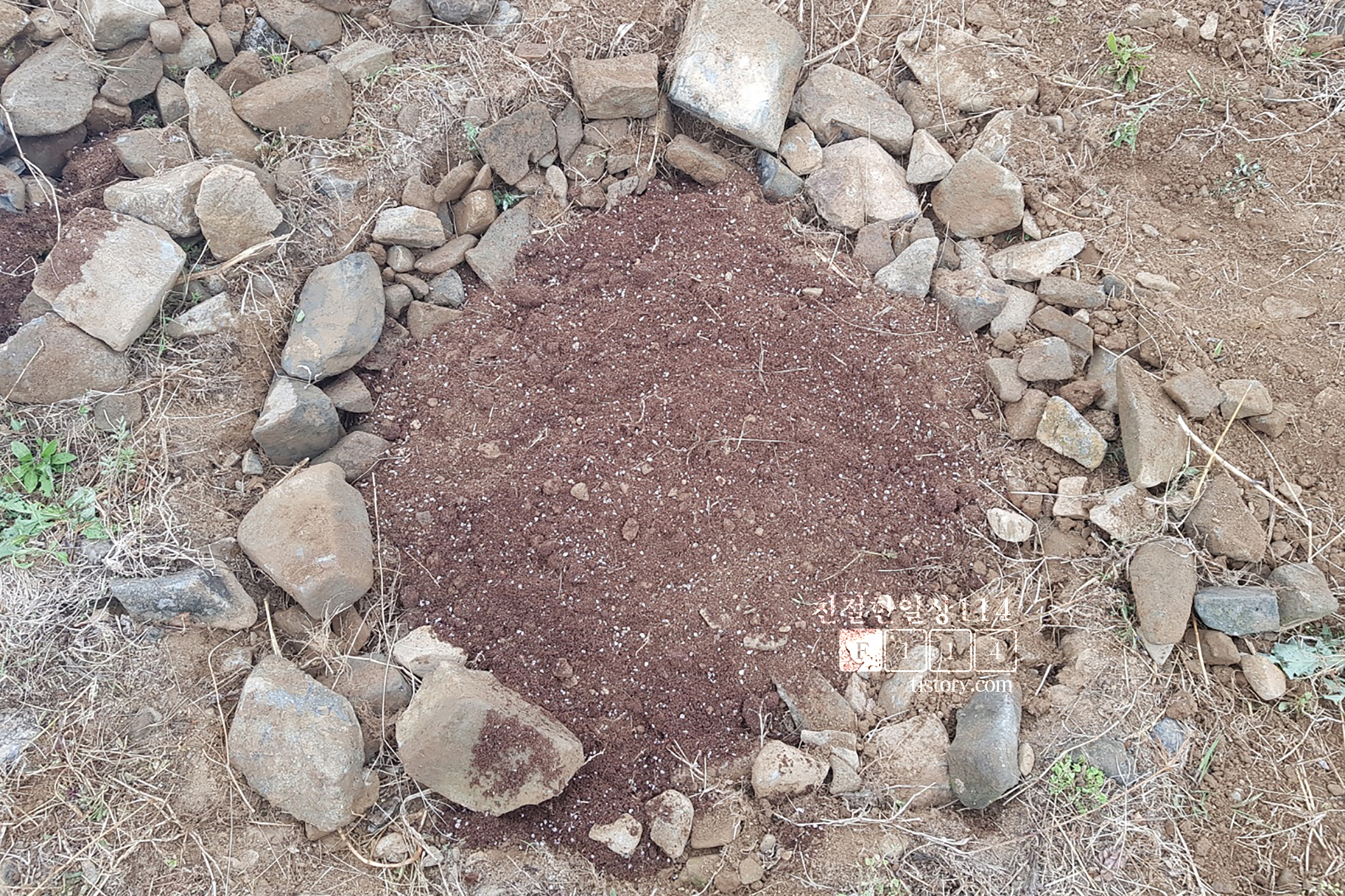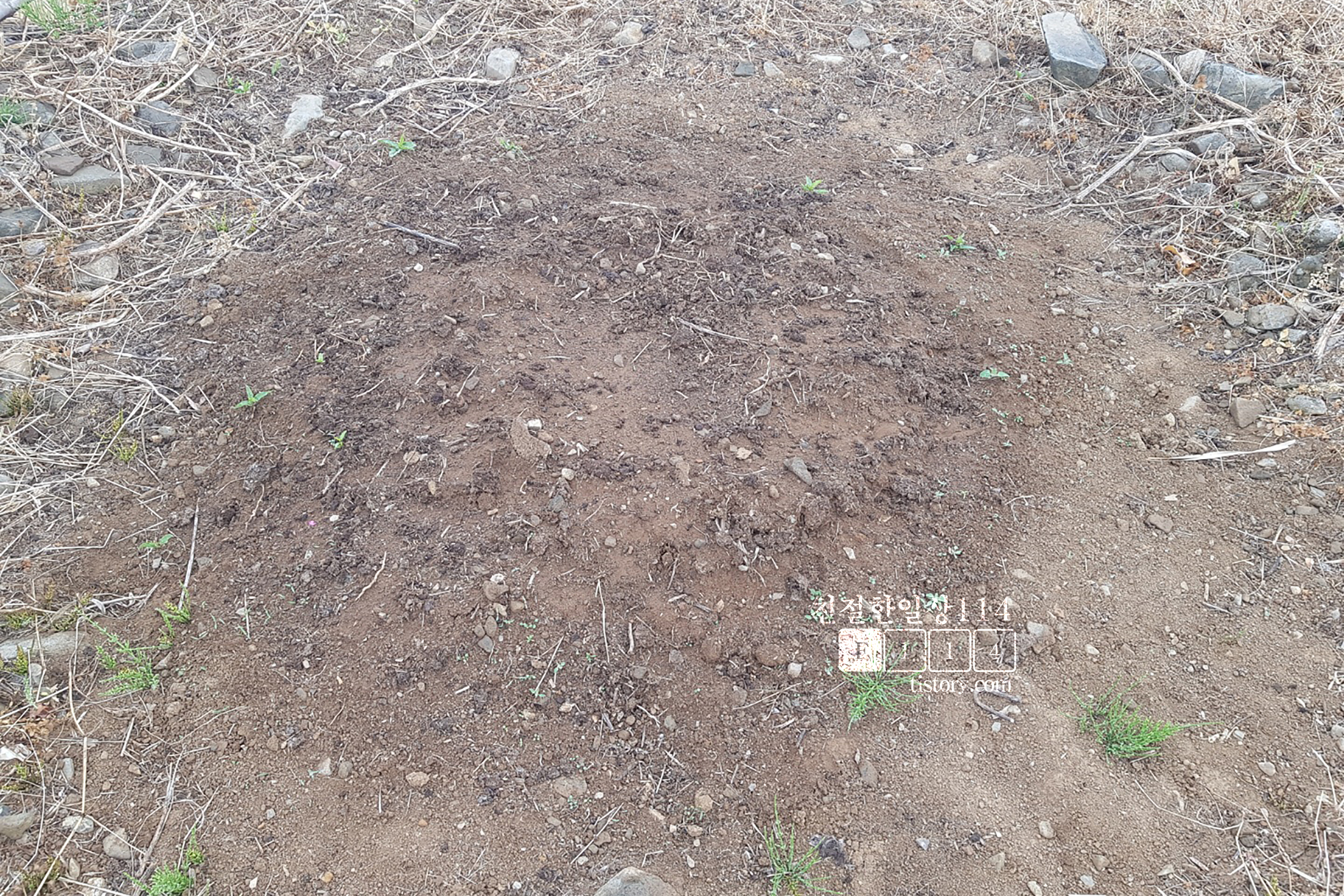 캐낸돌이 한가득. 씨를 심고 구덩이를 다시 되메울 흙이 부족할  것 같다. 그래도 거름이 한포대 있으니 퍼낸 흙과 잘 섞어서 해보기로 하고 다시 열심히 구덩이를 판다.