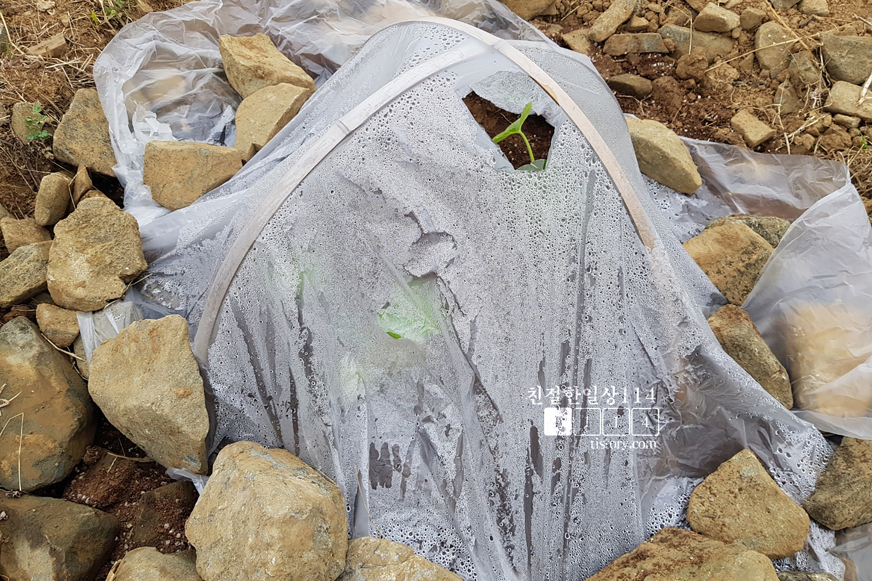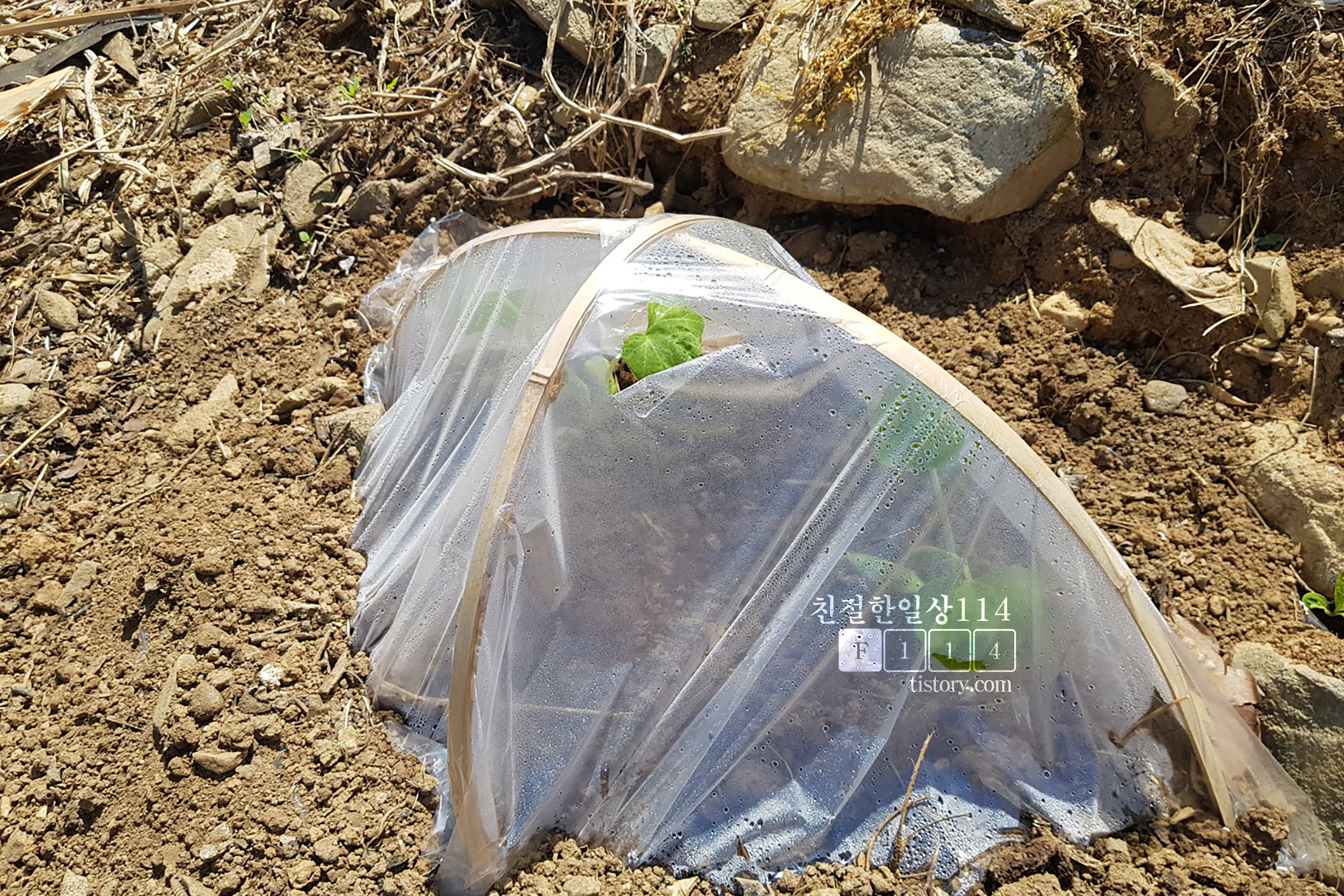 아마도 이웃집 할아버지께서 필자의 생각을 읽으셨는지 하우스를 만들어 두신 것이다! ㅜ 바람과 햇볕을 그대로 받으며 있는 작은 호박 모종이 애처로우셨는지도 모르겠다.