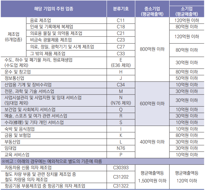먼저 업종별 규모기준은 주된 업종의 3년 평균 매출액 기준이 충족 되어야 하며 업종별 자세한 규모기준은 아래표를 참고하도록 하자.
