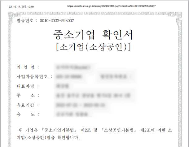개인사업자로 온라인 유통사업 영위중에 있다. 최근 중소기업임을 증빙할 일이 있어 중소기업현황정보시스템에서 중소기업확인서를 발급 받았다.