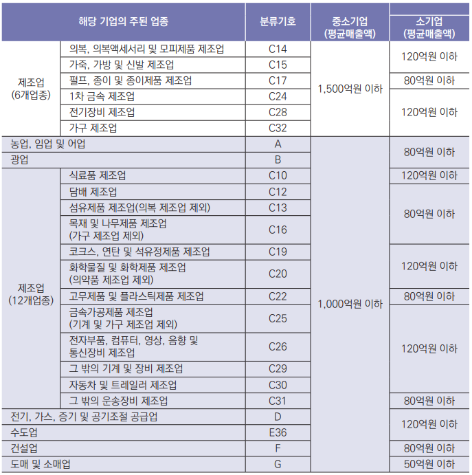 먼저 업종별 규모기준은 주된 업종의 3년 평균 매출액 기준이 충족 되어야 하며 업종별 자세한 규모기준은 아래표를 참고하도록 하자.