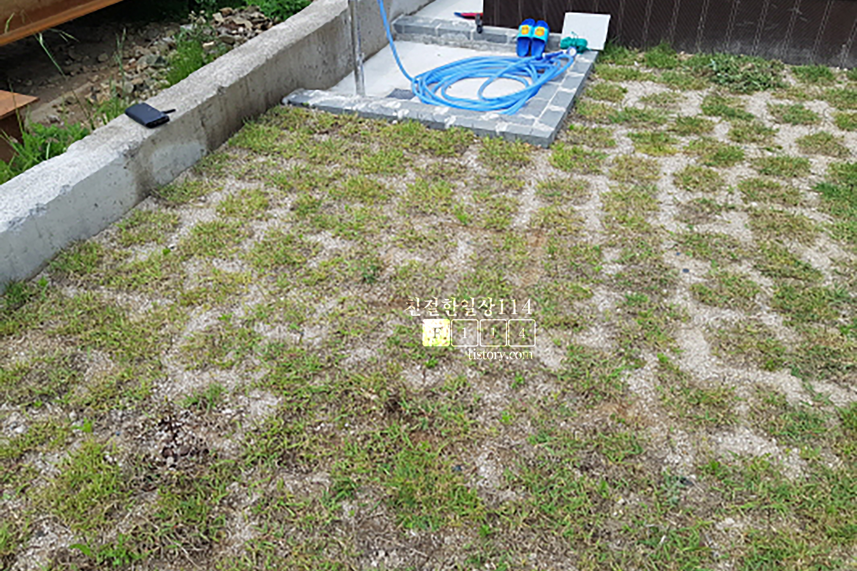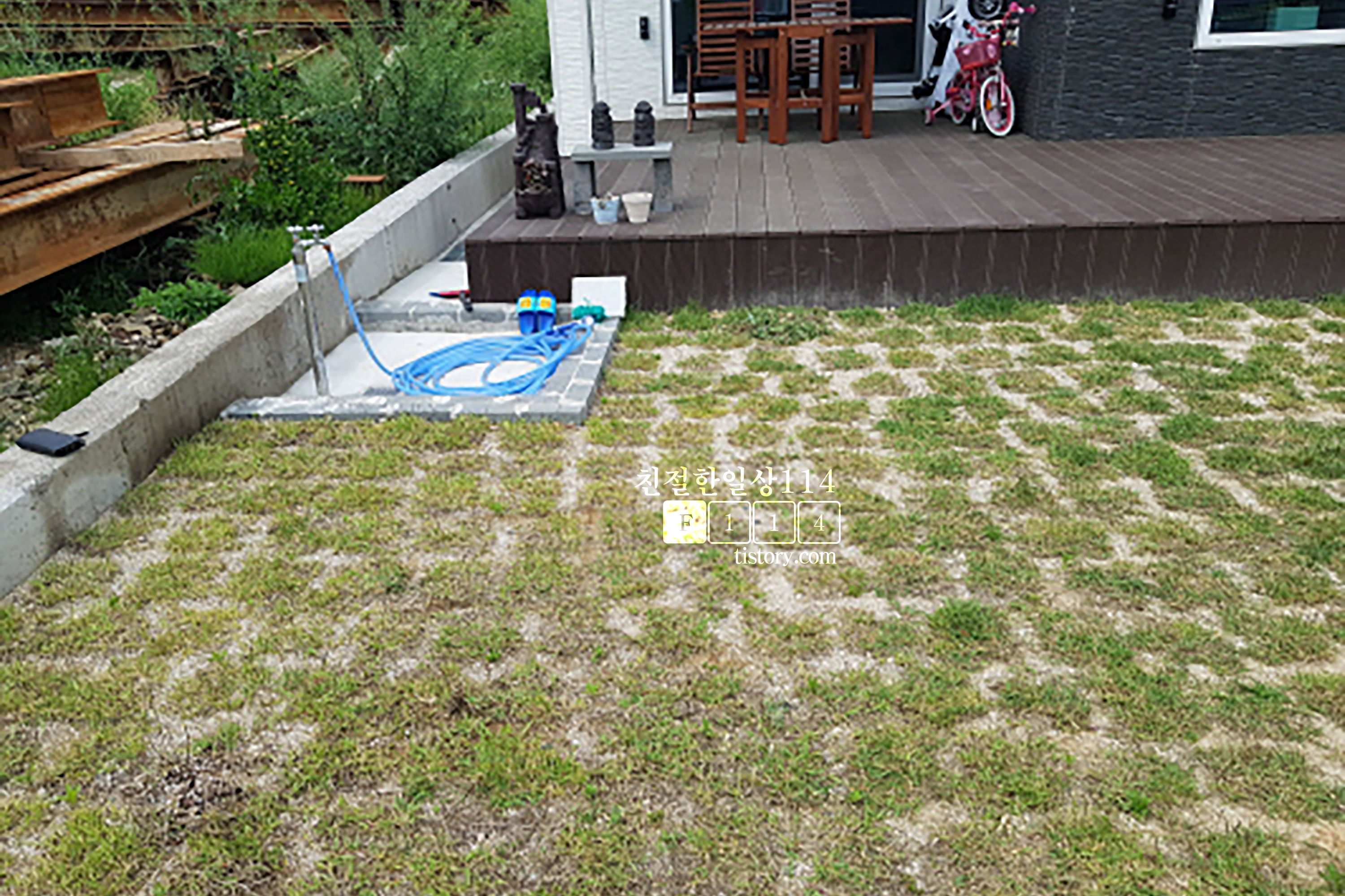 파라솔 설치할 위치는 외부 수돗가가 있는 데크 앞쪽 마당이다.