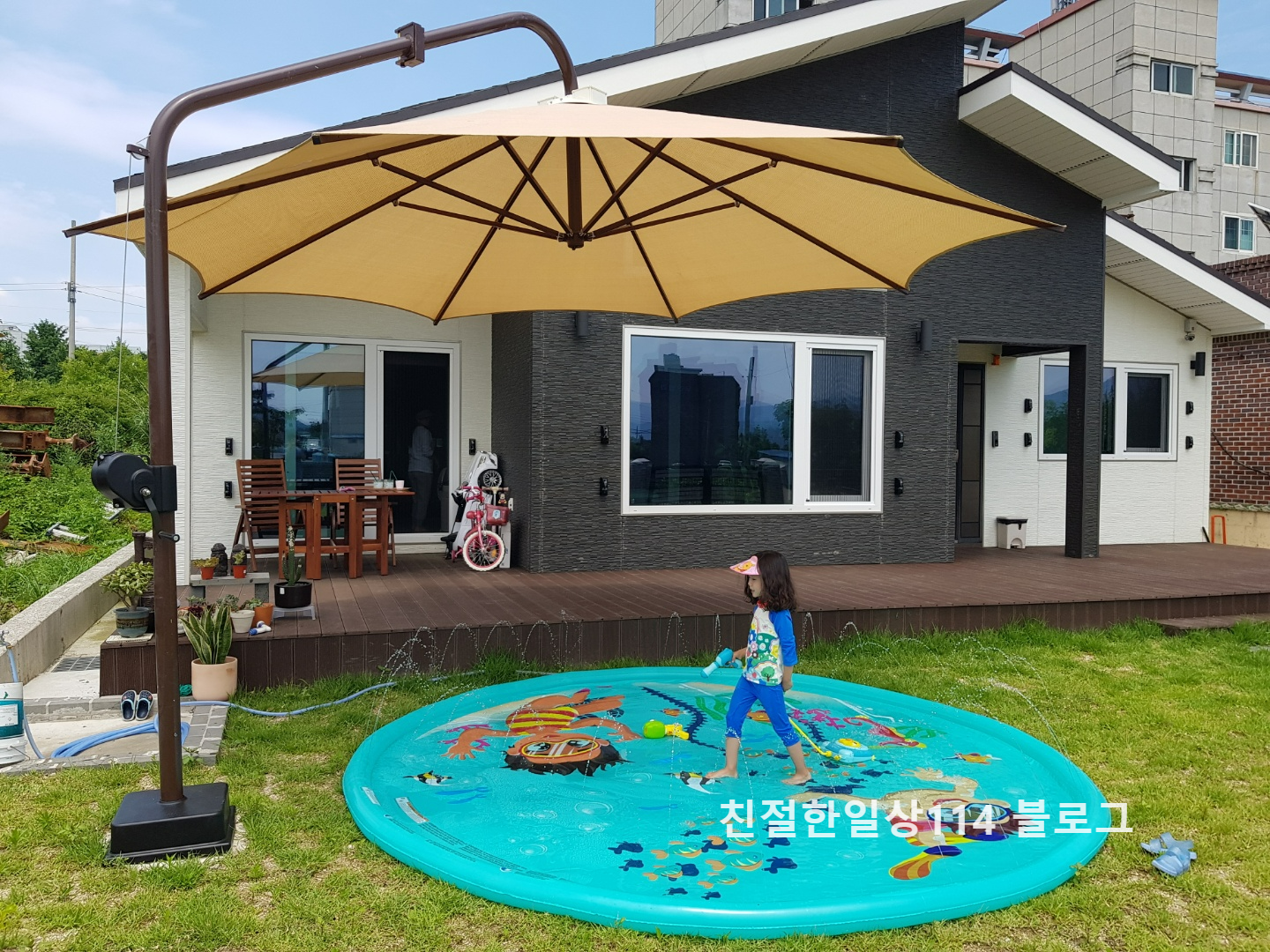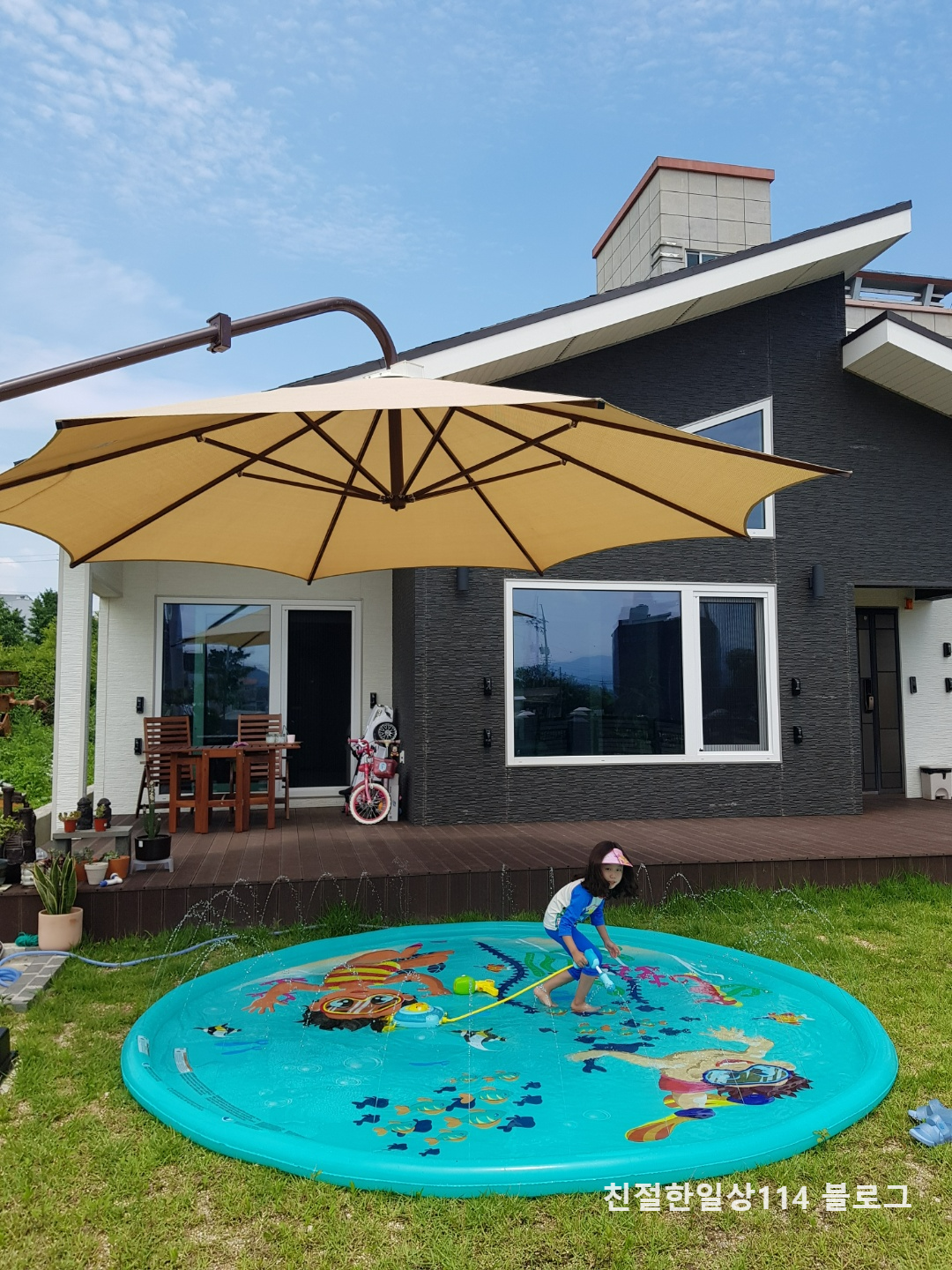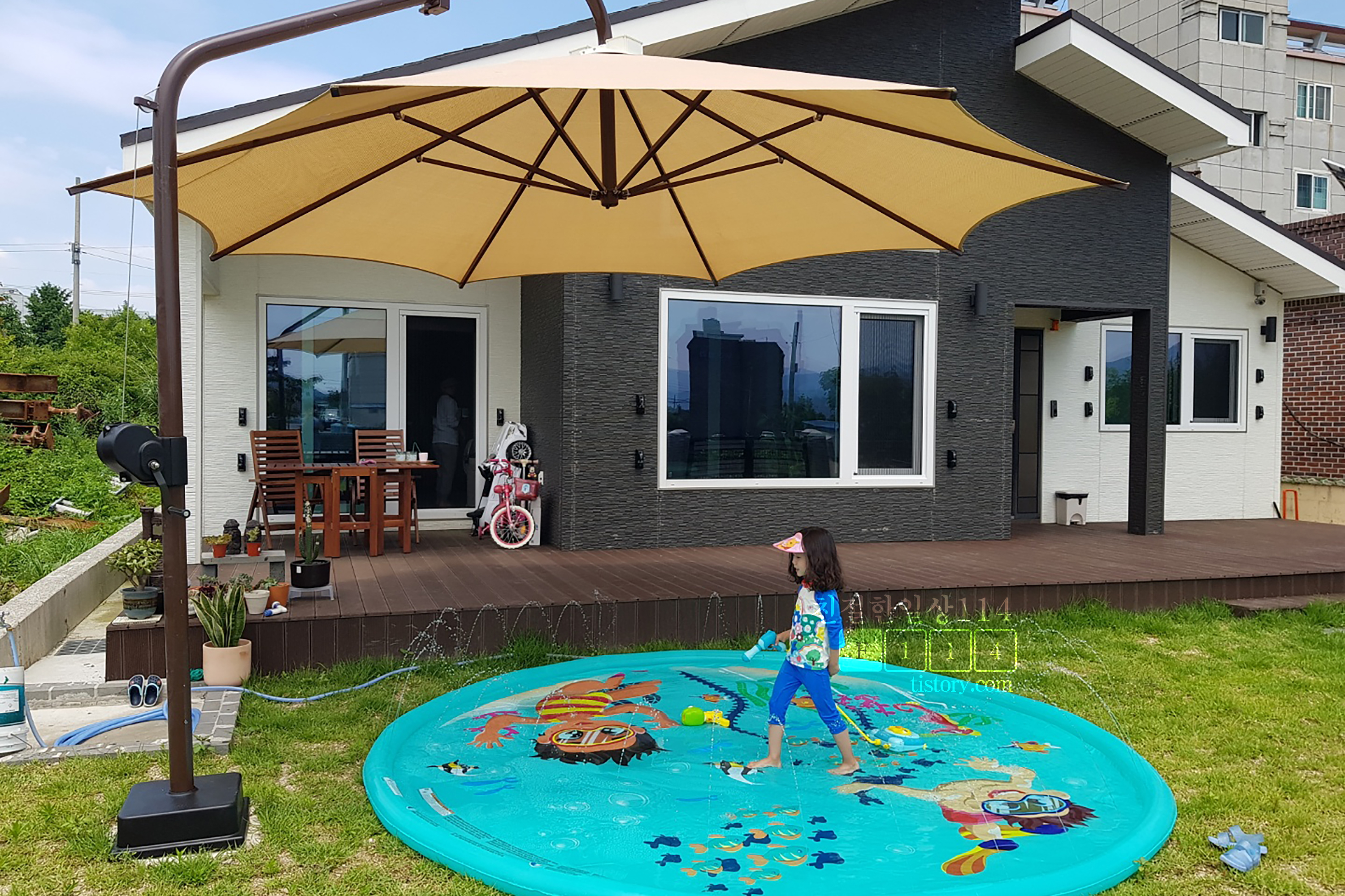 지구 온난화가 피부로 느껴지는 요즘이다. 날씨가 이렇다보니 집 앞 데크와 마당에서 쉬거나 놀기가 어렵다. 파라솔이나 그늘막을 설치하면 그늘 아래서 물놀이도 하고 음료를 마시거나 쉴 수