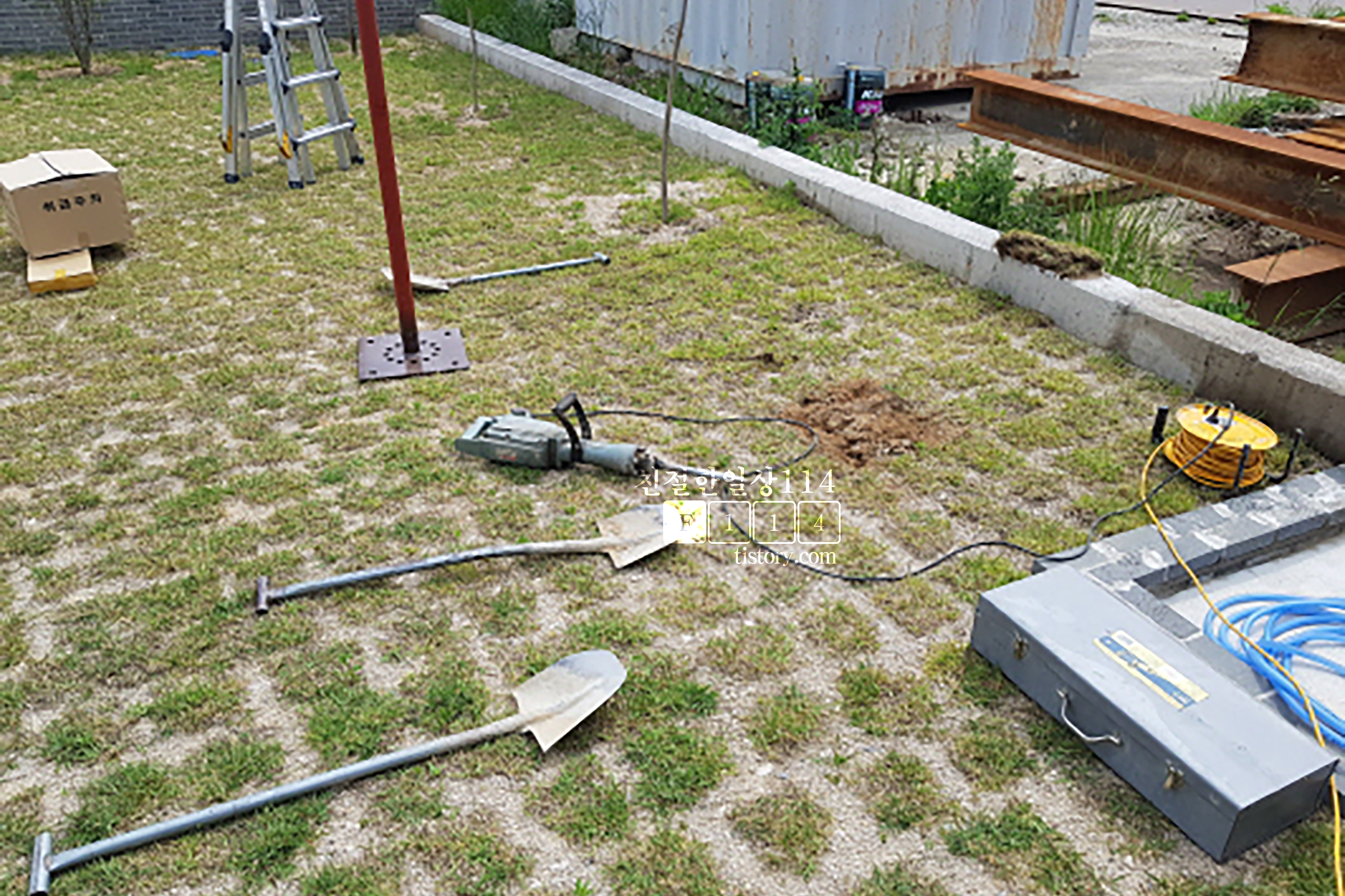 설치할 곳 위치를 표시하고는 땅을 파기위해 작업도구들을 챙겨온다. 파라솔이 크므로 흔들리거나 쓰러지지 않게하기 위해 단순 설치가 아니라 공사가 진행된다.