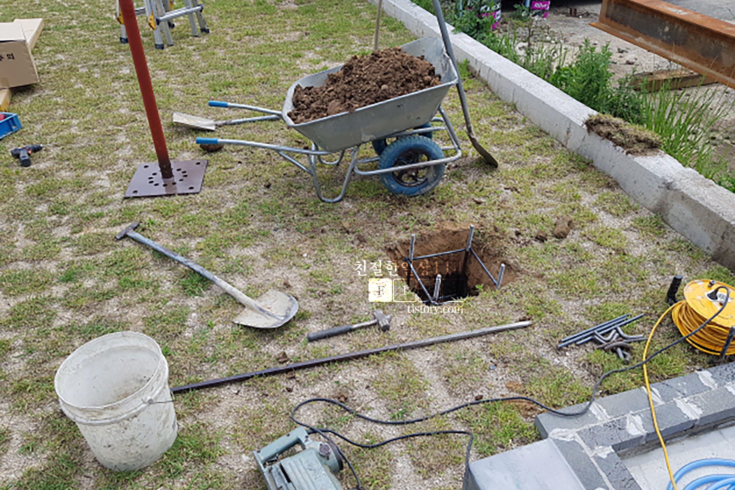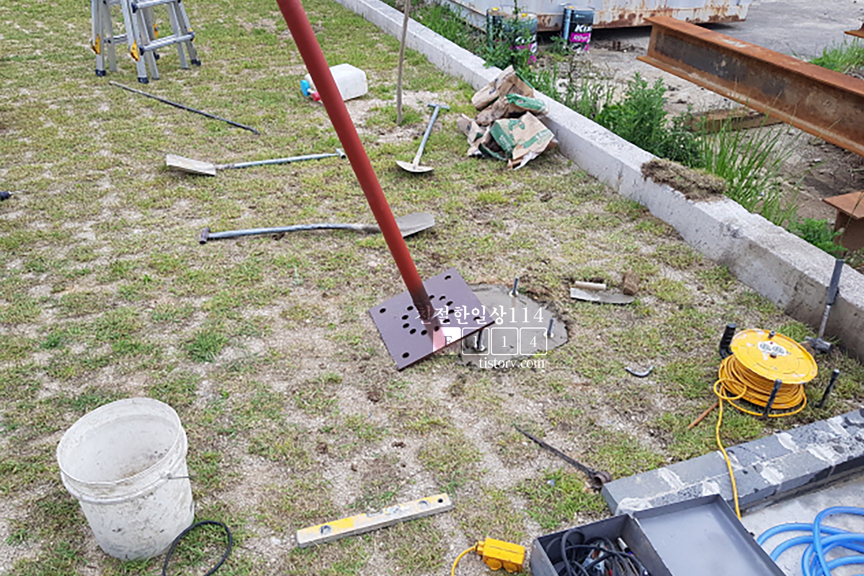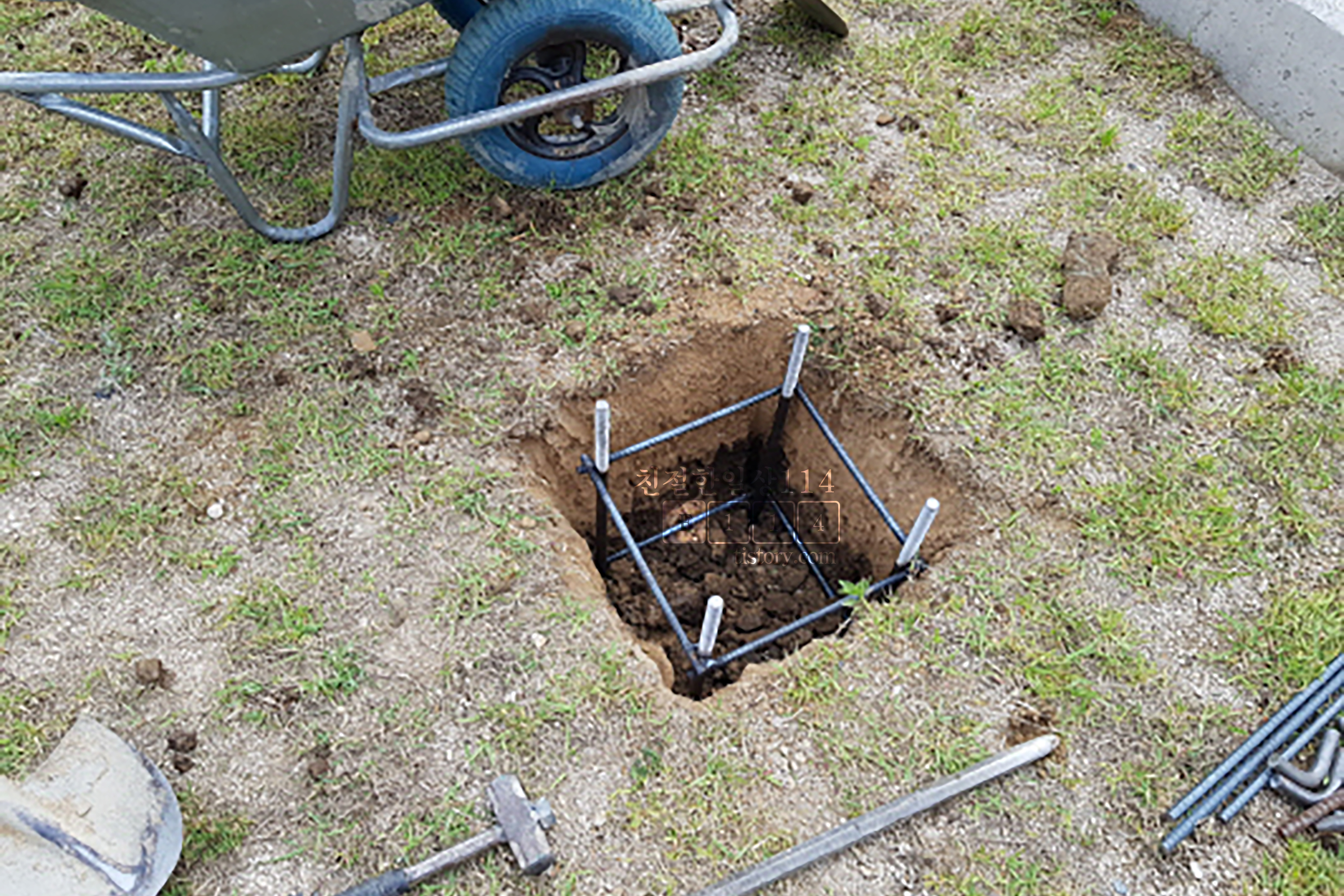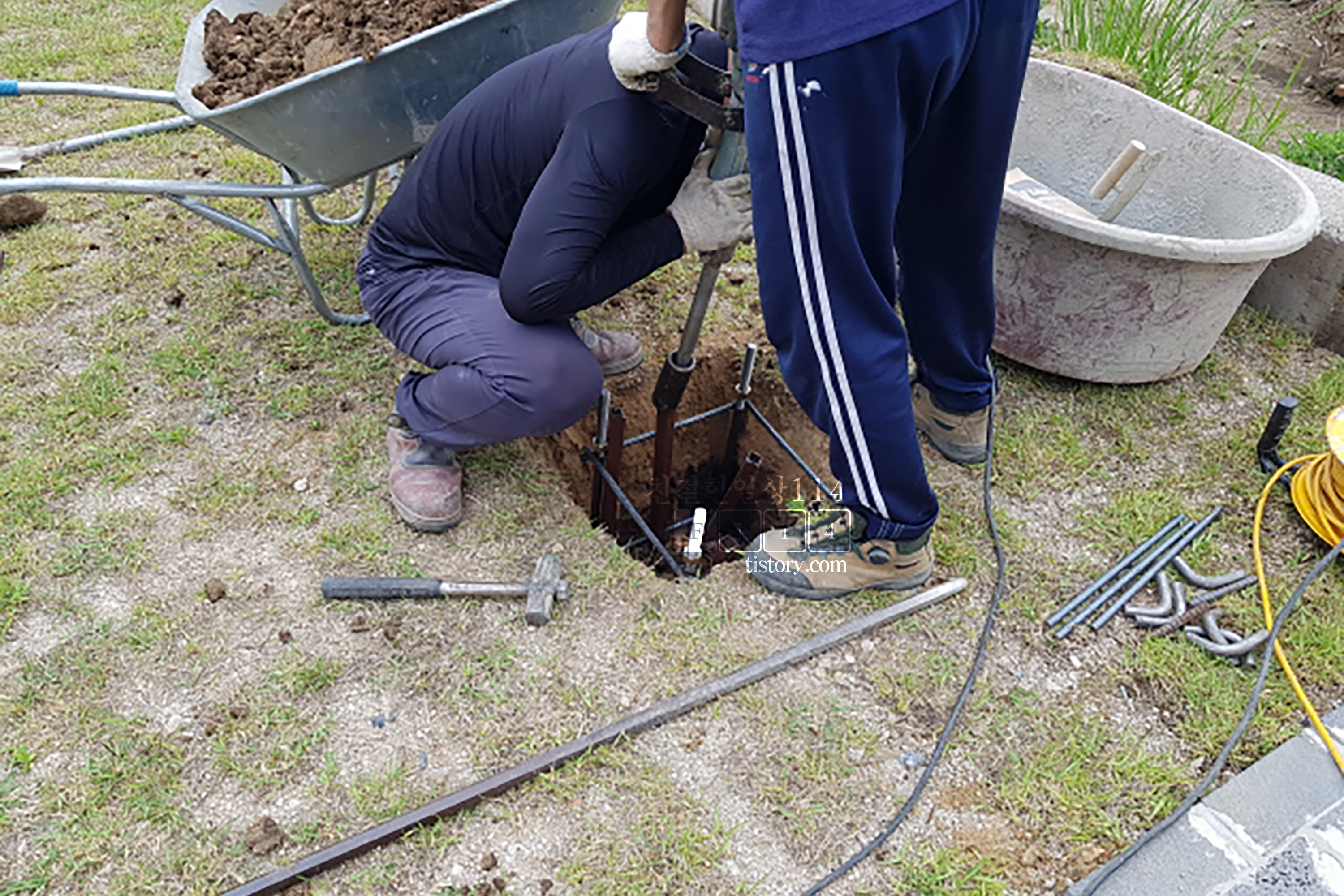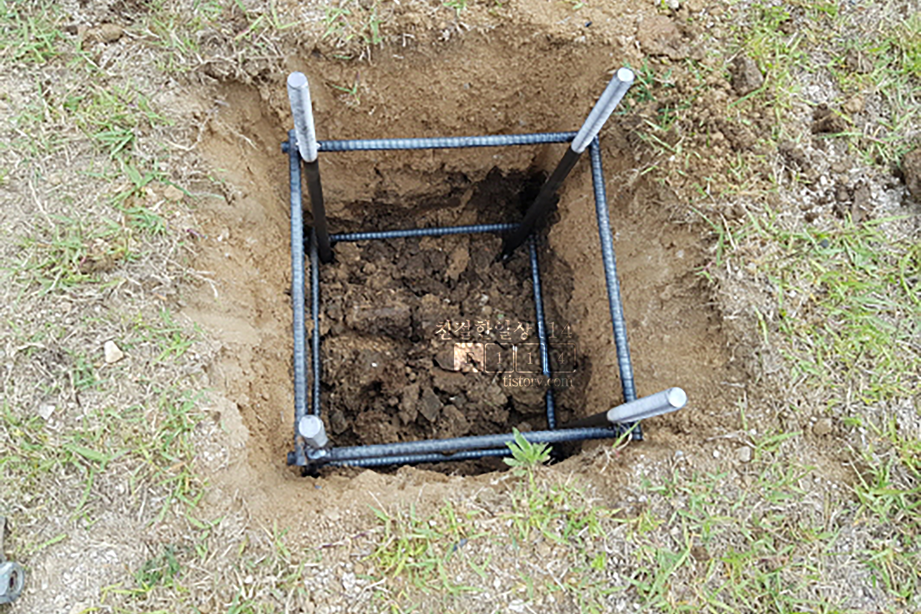 파낸 땅에 철근을 박고 거기에 더 굵은 쇠를 심는다.