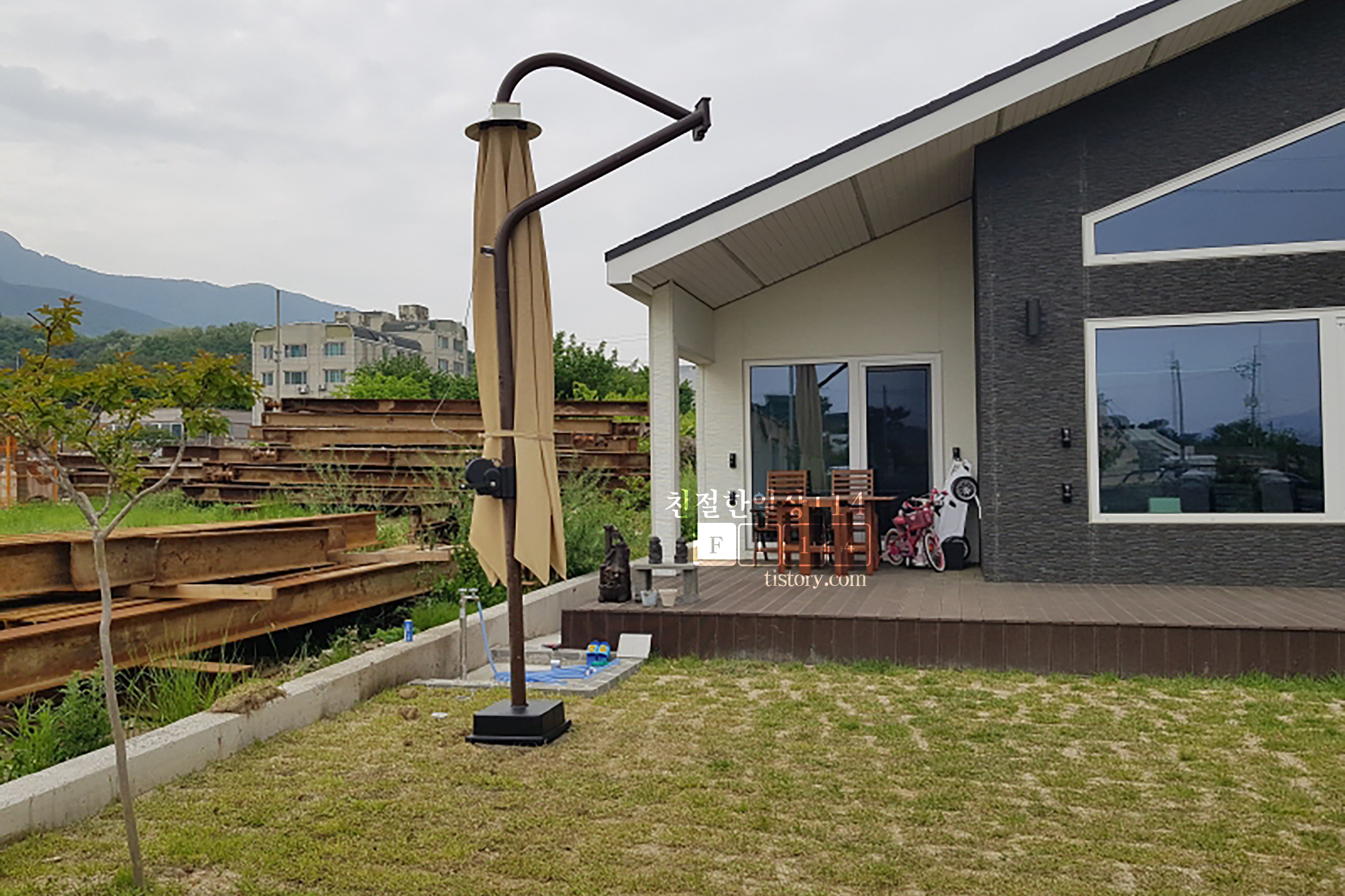 집에 설치한 대형 파라솔 제품 가격, 주문에 대한 내용은 아래의 이전 포스팅에서 자세히 확인 해 볼 수 있다.