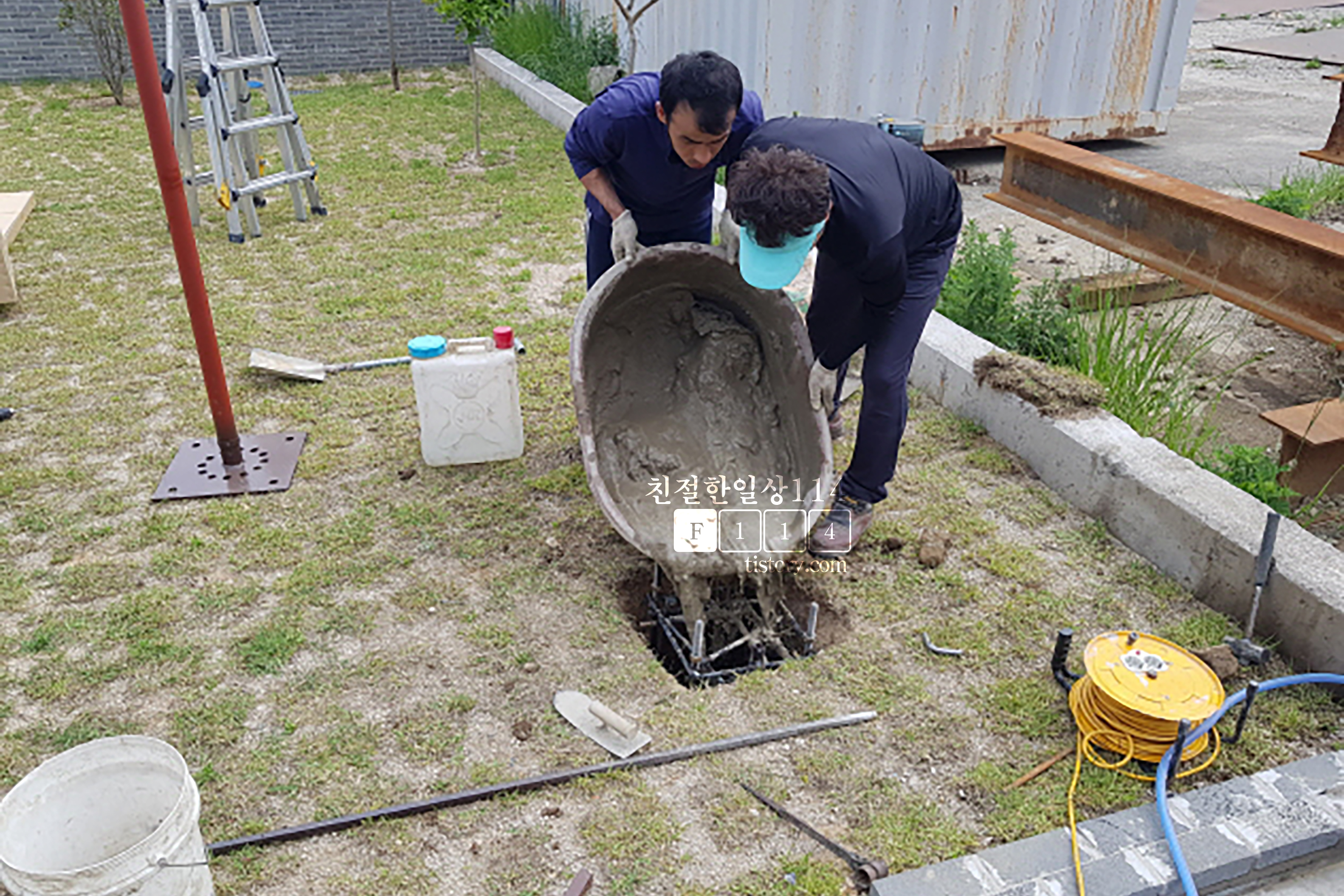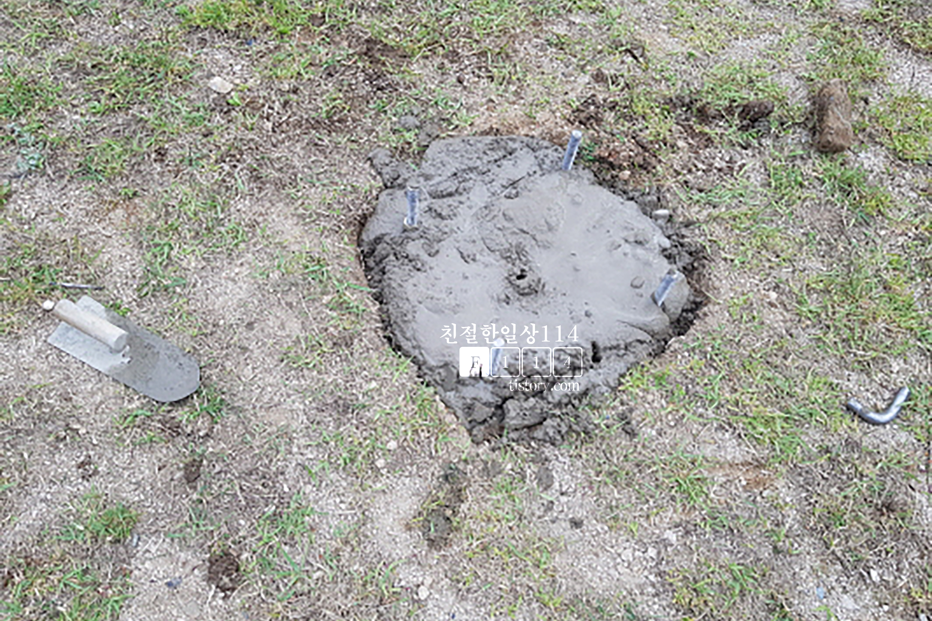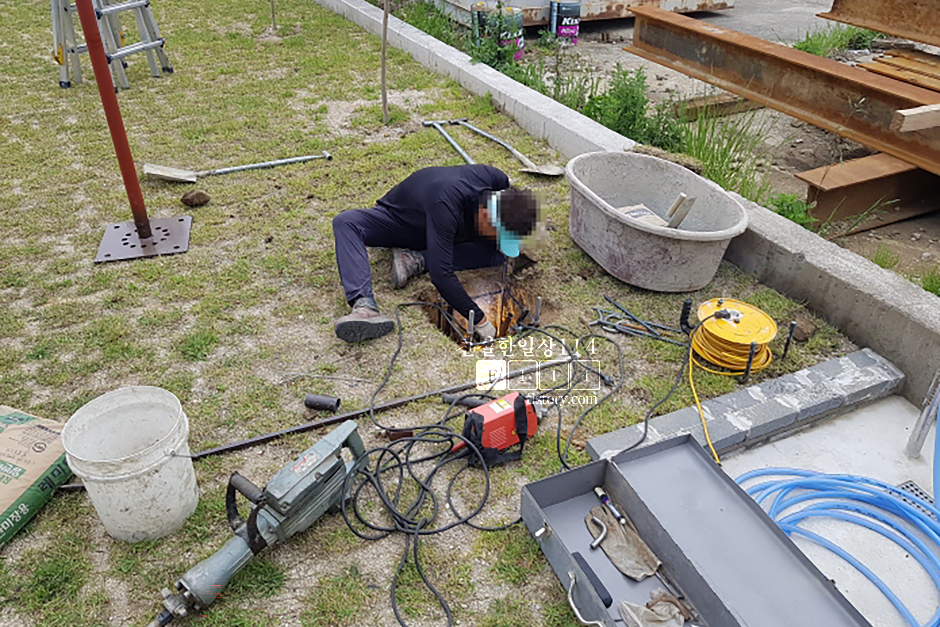 용접이 끝나고 시멘트를 구멍안에 가득히 차도록 메워준다.