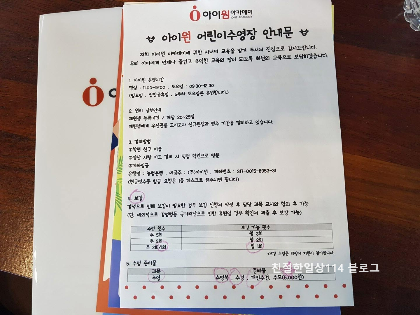 등록하고 안내문을 나눠주며 설명을 해준다. 아프거나 개인사정으로 수업에 빠지게되면 월 1회에 한해 보강수업이 가능하다. (주 2회 or 1회 수업시 2회 보강은 안됨.) 준비물은 수영복, 수경, 수건이며 수모는 5000원을 내면 수업 레벨에 맞춰서 지급해 준다.