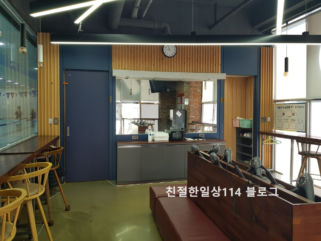 밖에서 기다리면서 통유리를 통해 수영장 안을 훤히 볼 수 있다. 부모 입장에서는 좋지만 수영하는 어린이와 선생님들은 부담 스러울것 같다. (익숙해지면 괜찮을려나?)