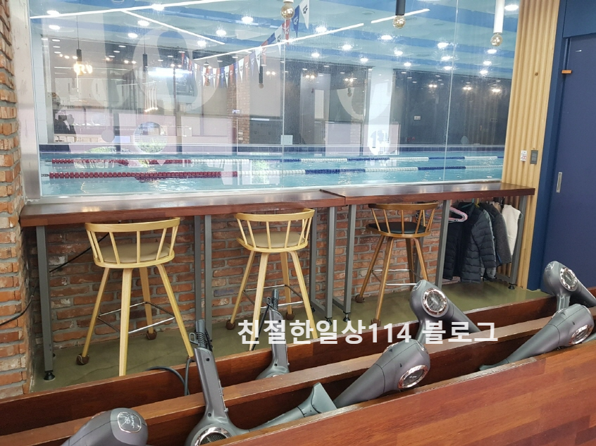 밖에서 기다리면서 통유리를 통해 수영장 안을 훤히 볼 수 있다. 부모 입장에서는 좋지만 수영하는 어린이와 선생님들은 부담 스러울것 같다. (익숙해지면 괜찮을려나?)
