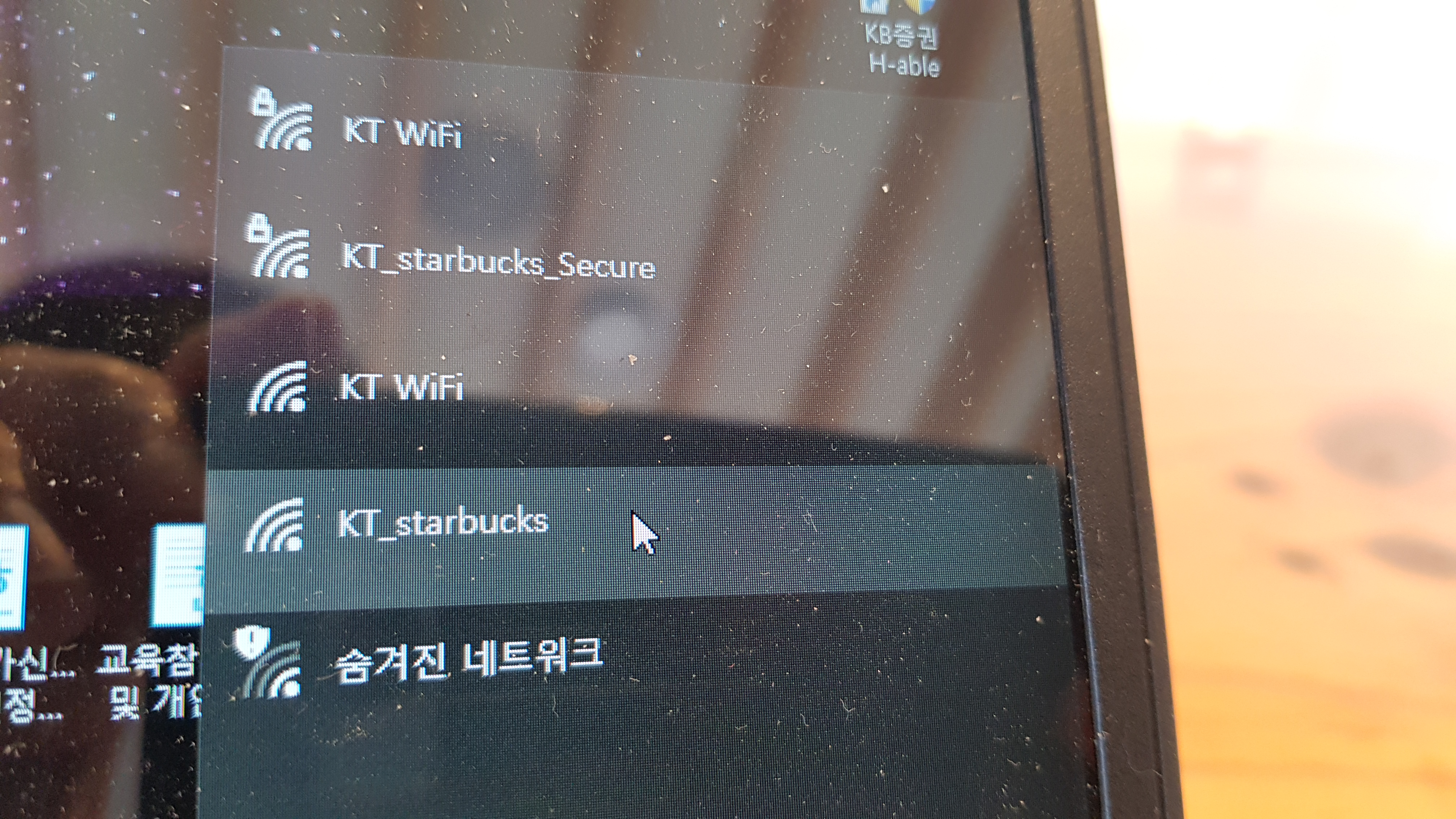 와이파이 목록 5개 중에서 KT_starbucks 를 선택해서 클릭하자.