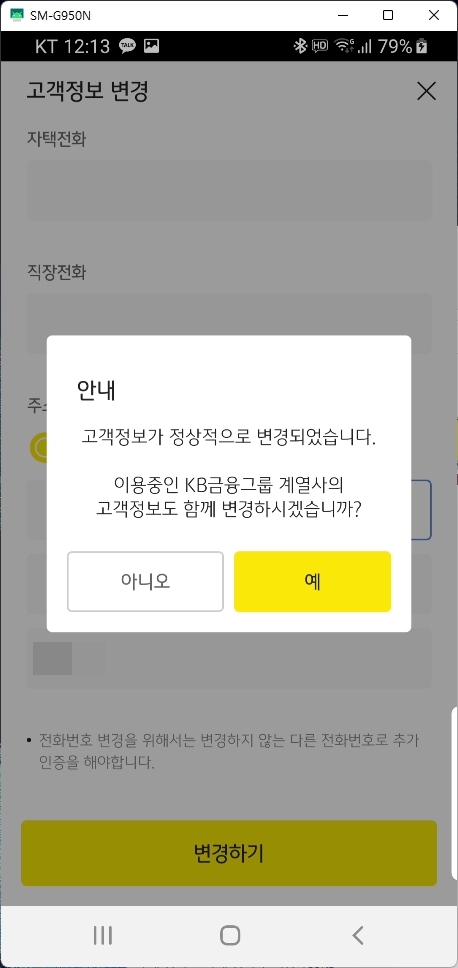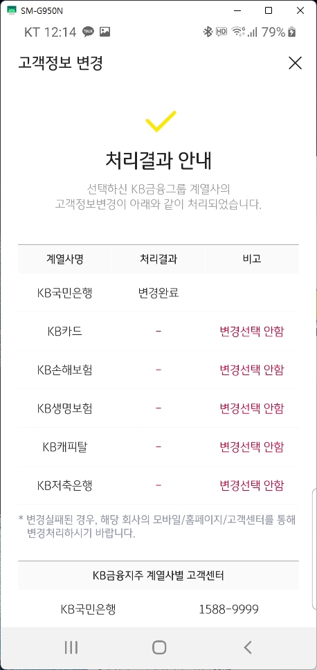 KB 금융의 다른 계열사에도 변경한 주소를 같이 적용할지 선택할 수 있다. 필자는 KB국민은행의 주소지를 함께 변경했다. 그리고 바로 처리결과를 확인 할 수 있었다.