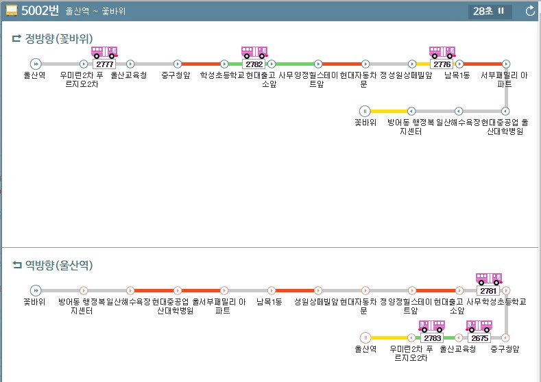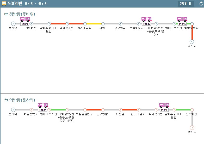 [5001번: 울산역l15416 - 굴화주공 아파트앞l40223 - 무거복개천l22003 - 십리대밭교l22013 - 시청l31111 - 남구청앞l31009 - 보람병원입구l31713 - 태화강역1,2번l12313 - 현대미포조선l24248 - 화암중학교l26505 - 꽃바위l19016]