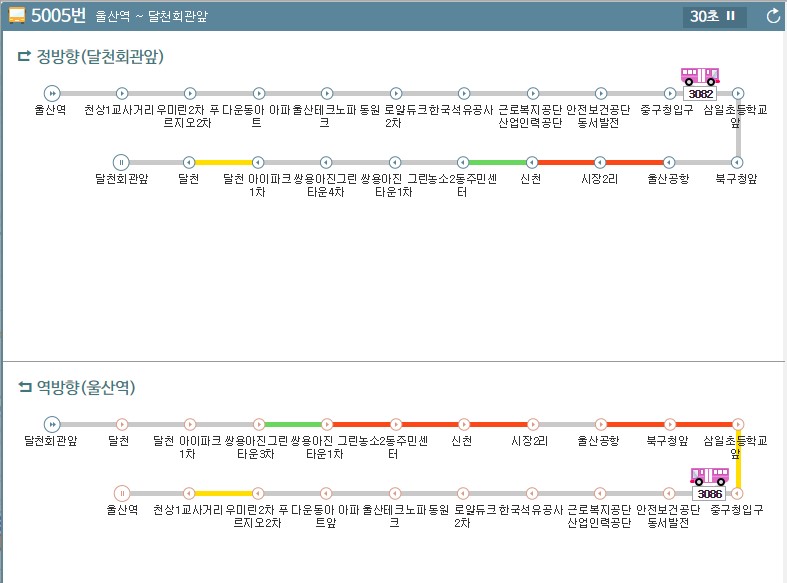 [5005번: 울산역l15416 - 천상1교사거리l40214 - 우미린2차 푸르지오2차l20415 - 다운동아 아파트l21124 - 울산테크노파크l11420 - 동원 로얄듀크2차l11422 - 한국석유공사l11418 - 근로복지공단 산업인력공단l11416 - 안전보건공단 동서발전l11414 - 중구청입구l11412 - 삼일초등학교앞l30904 - 북구청앞l40332 - 울산공항l40328 - 시장2리l25308 - 신천l25306 - 농소2동주민센터l25302 - 쌍용아진 그린타운1차l20206 - 쌍용아진그린타운4차l20216 - 달천 아이파크1차l14211 - 달천l14526 - 달천회관앞l14509]