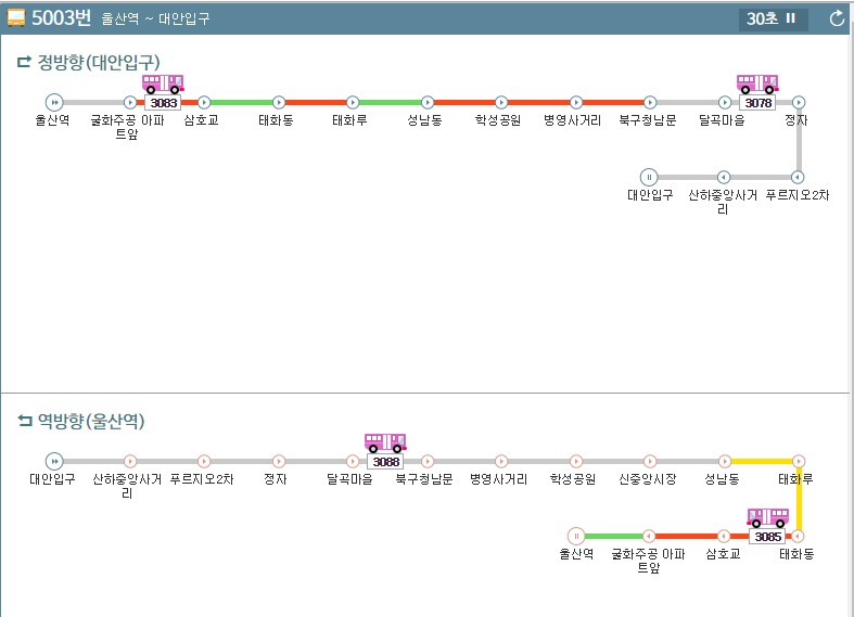 [5003번: 울산역l15416 - 굴화주공 아파트앞l40223 - 삼호교l21201 - 태화동l21207 - 태화루l21211 - 성남동l21605 - 학성공원l24302 - 병영사거리l40506 - 북구청남문l26342 - 달곡마을l26324 - 정자l26318 - 푸르지오2차l26358 - 산하중앙사거리l26378 - 대안입구l14015]