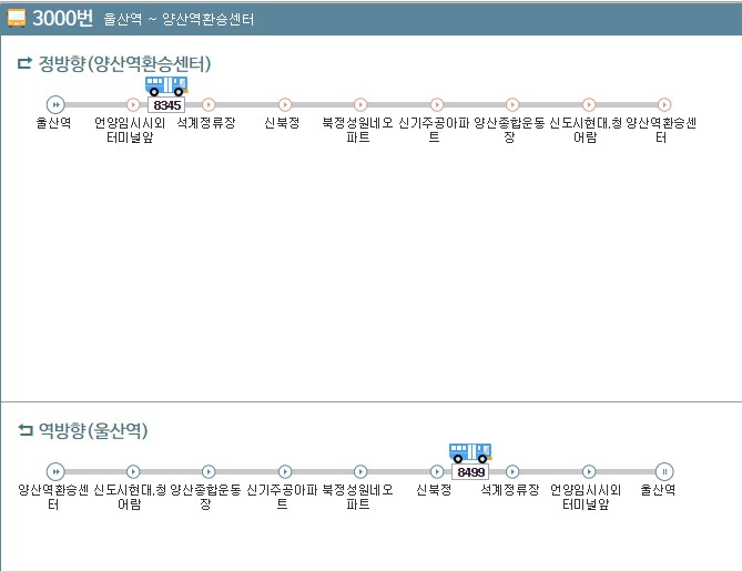 [3000번: 울산역l15429 - 언양임시시외터미널앞l30402 - 석계정류장l4726 - 신북정l59160 - 북정성원네오파트l4871 - 신기주공아파트l4867 - 양산종합운동장l4422 - 신도시현대.청어람l4526 - 양산역환승센터l4519]