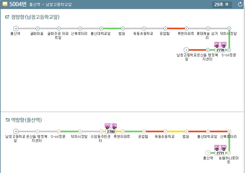 [5004번: 울산역l15416 - 굴화마을l40221 - 굴화주공 아파트앞l40223 - 신복로터리l30703 - 울산대학교앞l30707 - 법원l40605 - 옥동초등학교l40607 - 공업탑l40403 - 루첸아파트l31117 - 롯데캐슬 삼거리l22903 - 덕하시장앞l40107 - S-oil정문l40127 - 온산읍 행정복지센터l31606 - 남창고등학교앞l31517]