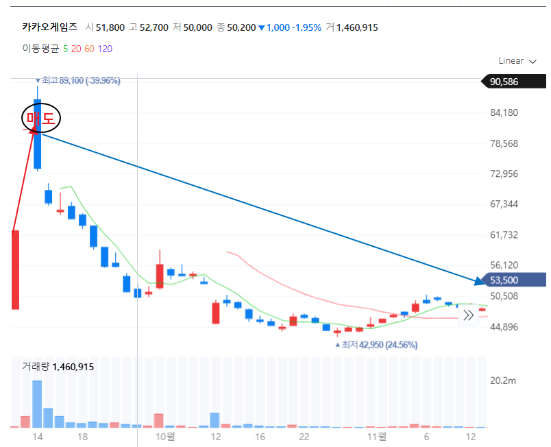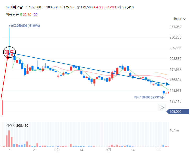 작년 IPO 시장의 핫이슈였던 카카오게임즈와 sk 바이오팜을 보더라도 상장후 강한힘으로 몇차례 상한가를 가고나서 상더이상 상한가를 못 가고 힘을 받지 못하는 날 이후로는 계속해서 내려앉는 추세이다. 그래서 이번 매도 시점은 상한가를 못가고 힘이 풀리는 날에 매도를 할 생각이었다.