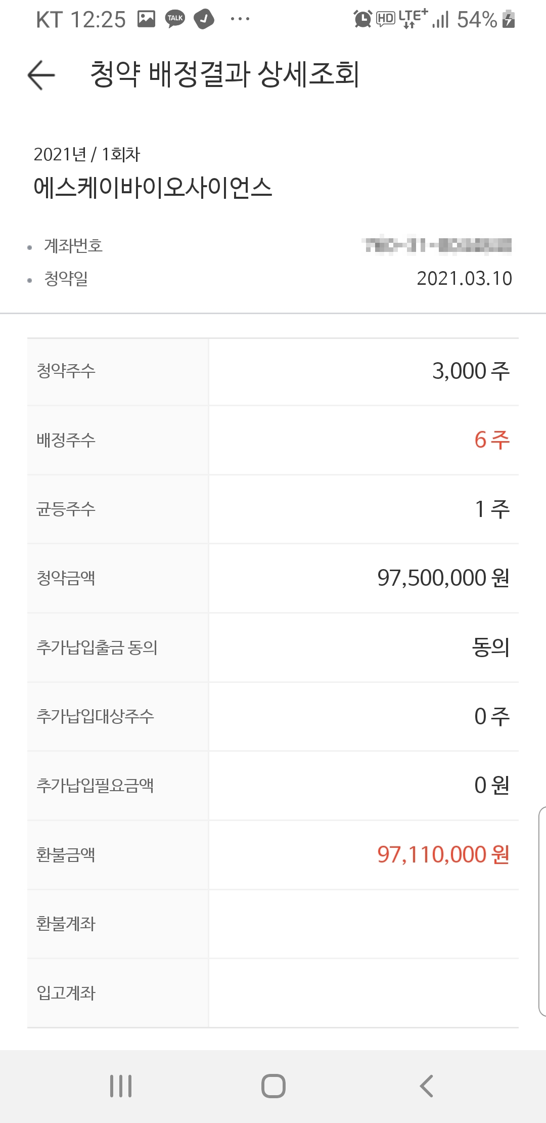 삼성증권으로는 배정물량이 많지 않았기에 큰 기대는 하지않고 균등배정주수라도 받자는 생각에 30주를 청약하였다. 이어 당일 개설했던 미래에셋으로는 3000주를 청약했다. 삼성증권은 배정물량에 비해 많은 청약이 몰리며 증권사중 가장 높은 경쟁률인 443:1 을 기록했으며 균등배정수도 못 받는 결과를 초래했다. 배정물량과 경쟁률을 보고 당일 개설했던 미래에셋대우증권에서 그나마 균등배정1주를 포함해 총 6주를 받아서 다행이라 여기기로 했다.